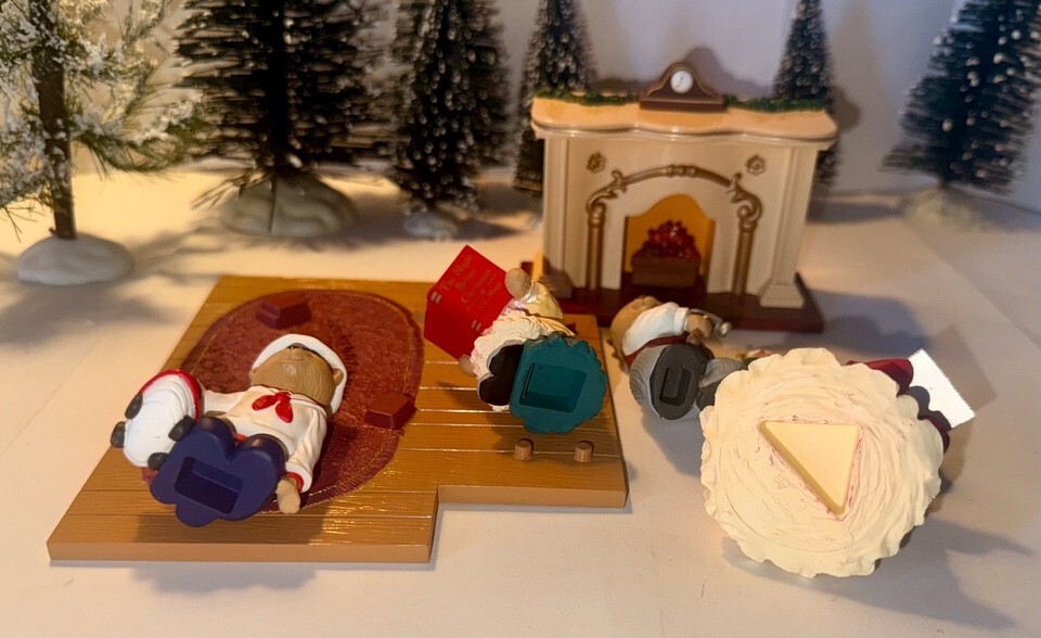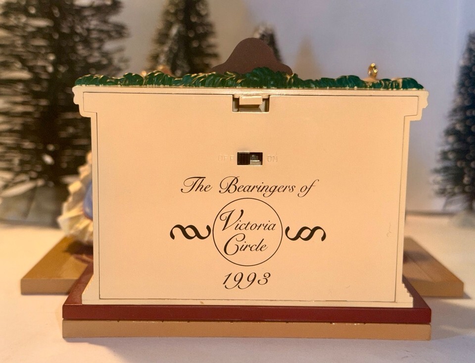 The Bearingers of Victoria Circle features a family of Victorian bears, including Mama Bearinger, Papa Bearinger, son Abearnathy Bearinger, and daughter Bearnadette Bearinger. Each ornament was designed to capture the charm of a Victorian Christmas and was sold separately. The fireplace is built as a stand for the bears and they are placed in position by matching up their corresponding shapes to the shapes on the floor.
