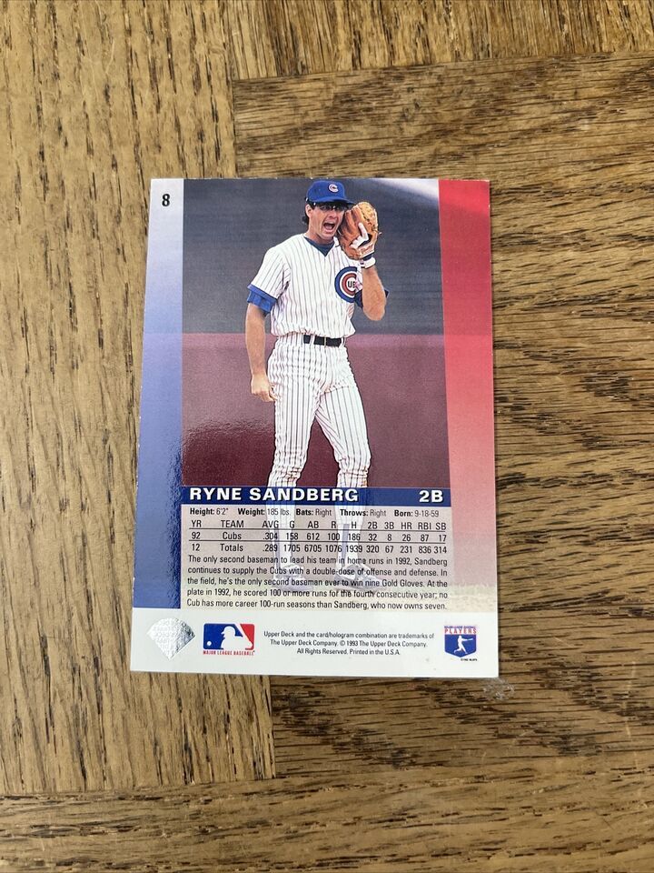 For fans of baseball and trading cards alike, this 1993 UD Ryne Sandberg Card #8 is a must-have addition to any collection. Featuring a high-quality image of the legendary Major League (MLB) player, this sports trading card is in excellent condition and perfect for avid collectors.