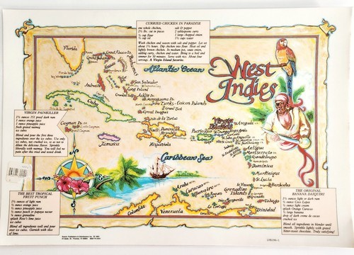 - 1993 West Indies St Croix Views Placemat Vintage Drink Recipes Map Theme DWII