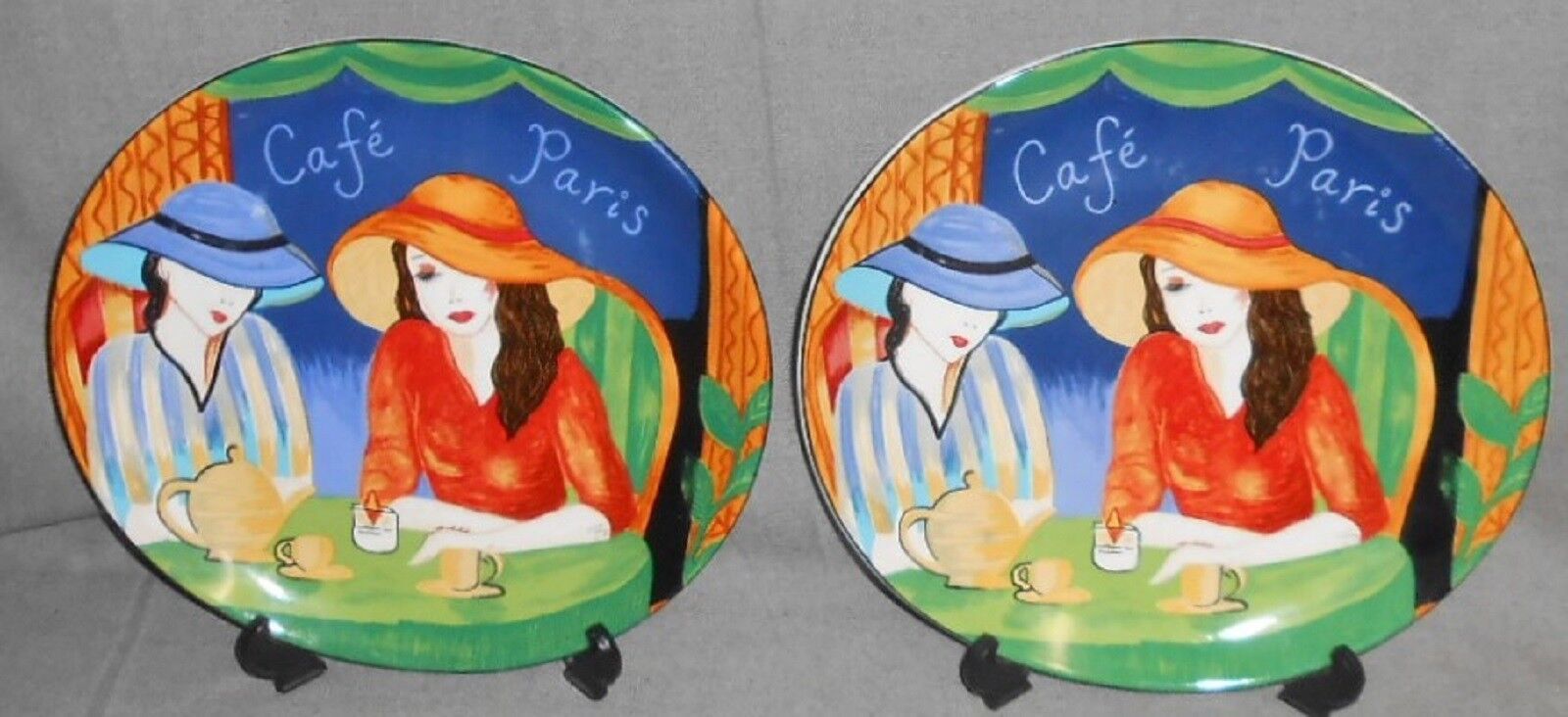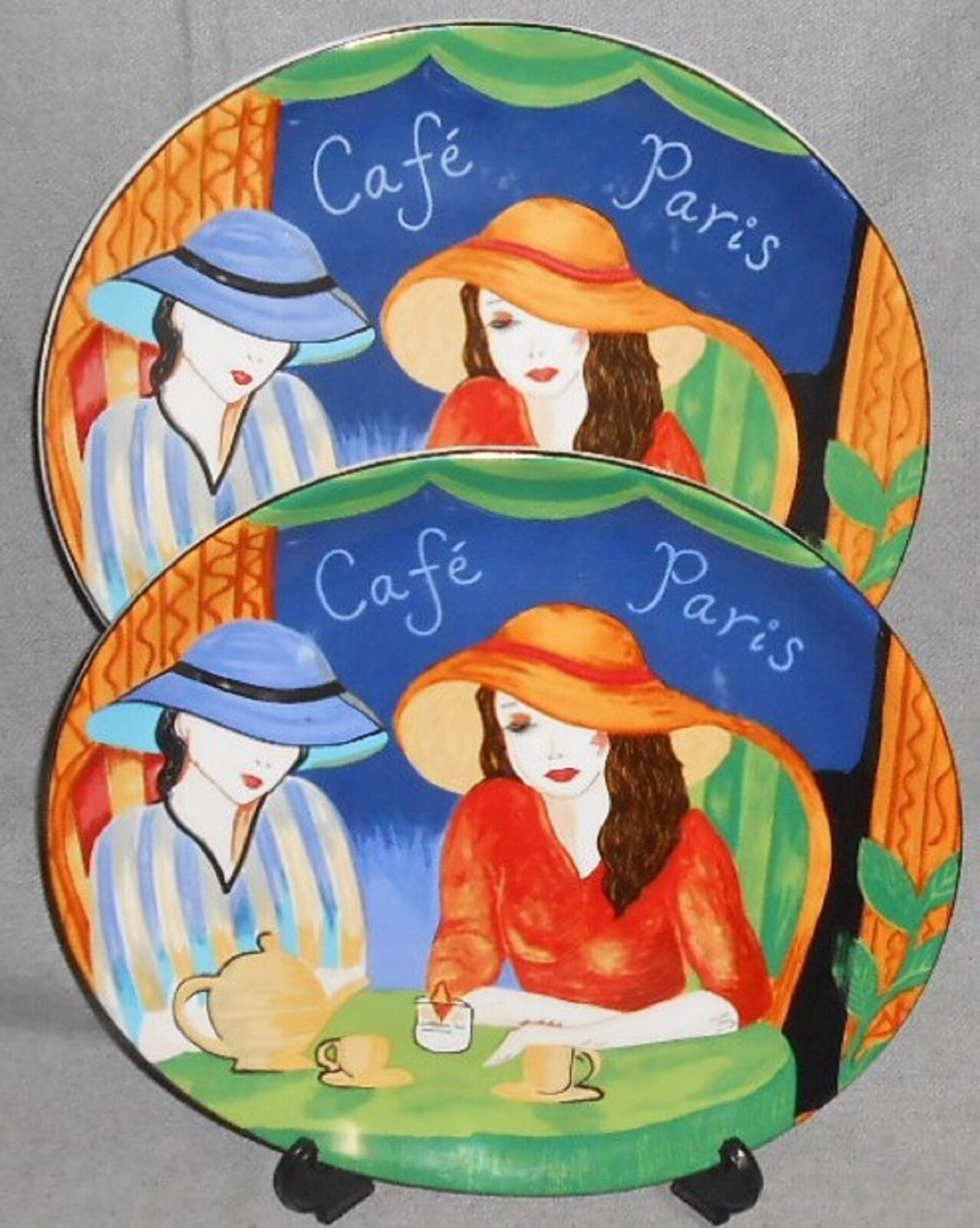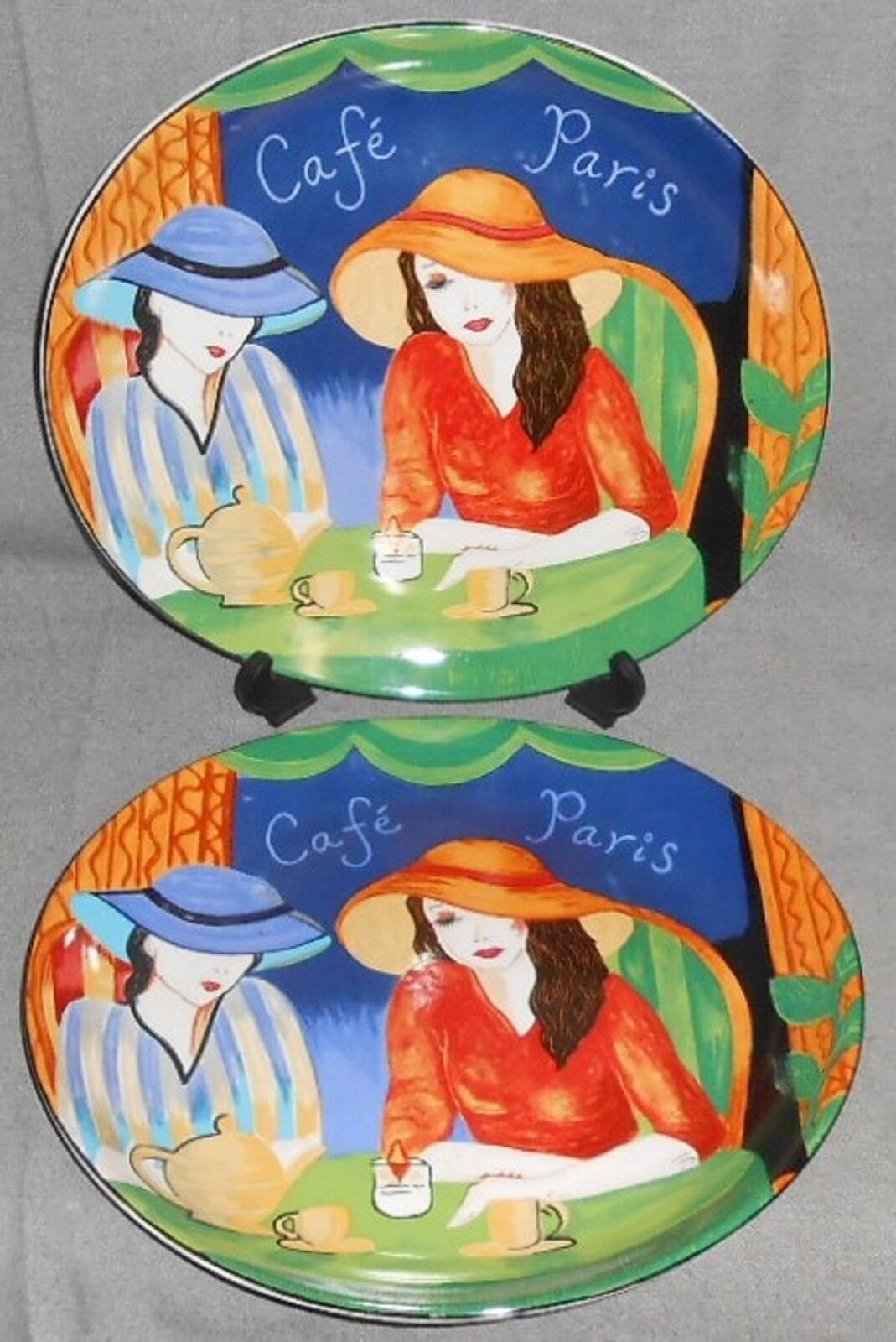 This is a set of (2) 11 1/4" Dinner Plates from 1994 Sango in the Cafe Paris Pattern. They are both in good pre-owned condition with no chips or cracks - some surface usage/wear present - colors in design are bright and vivid - see close up photos above for fine details on each plate.