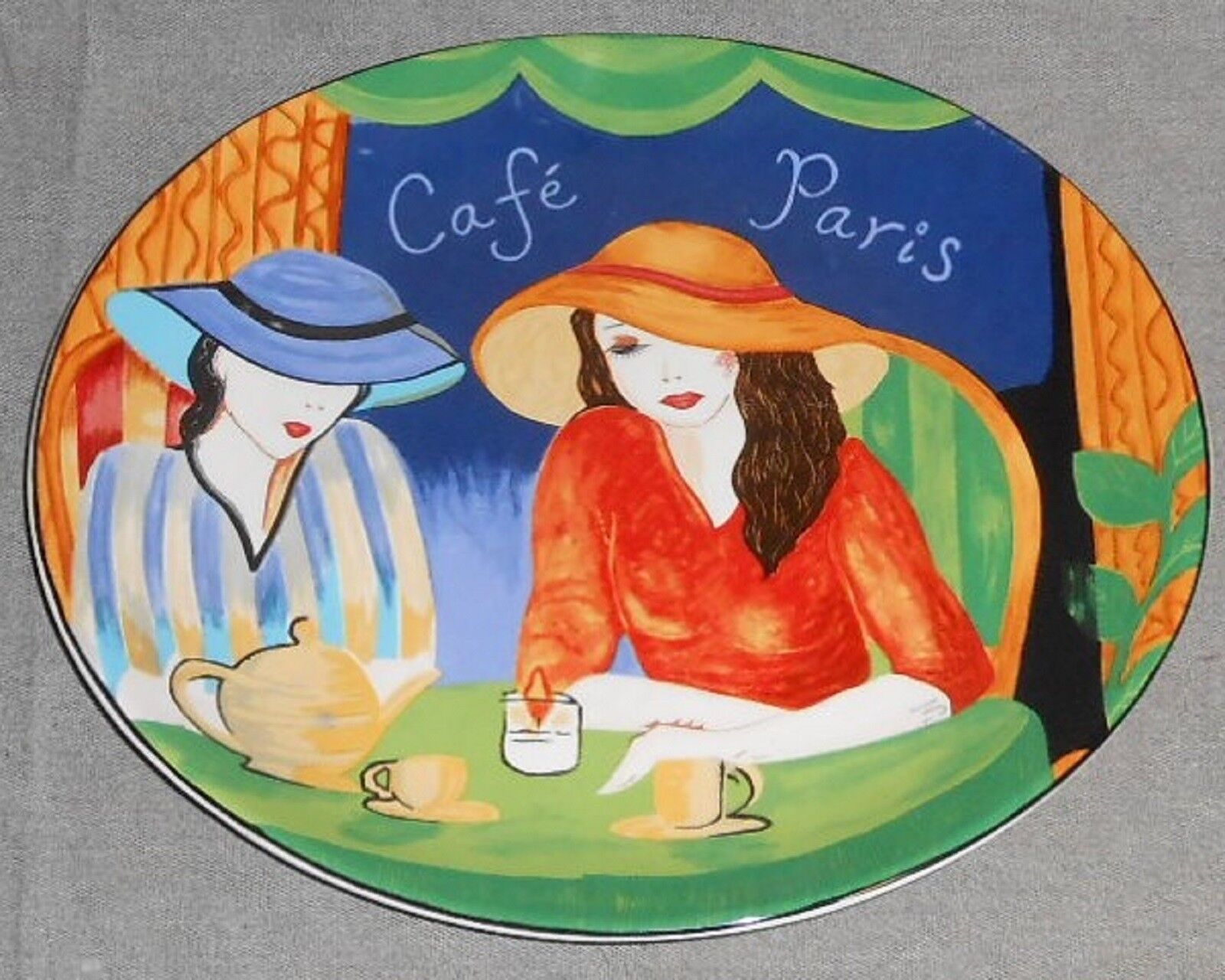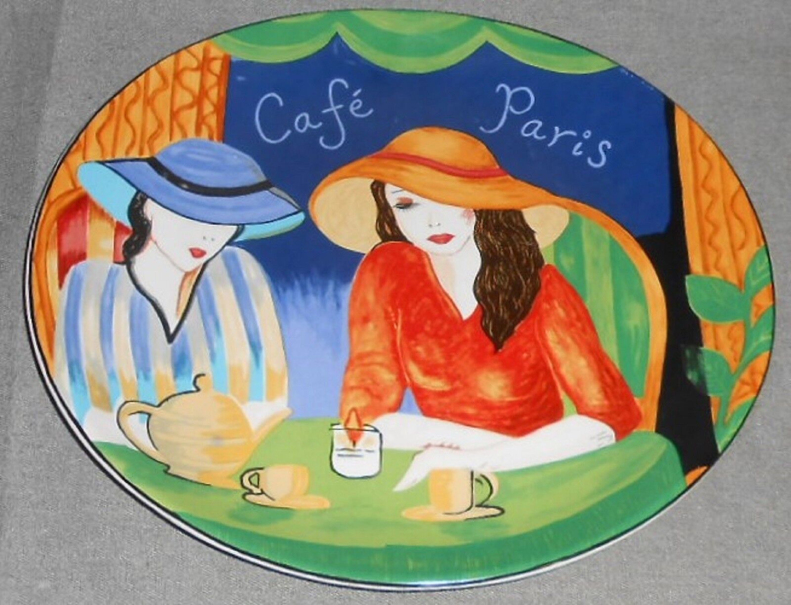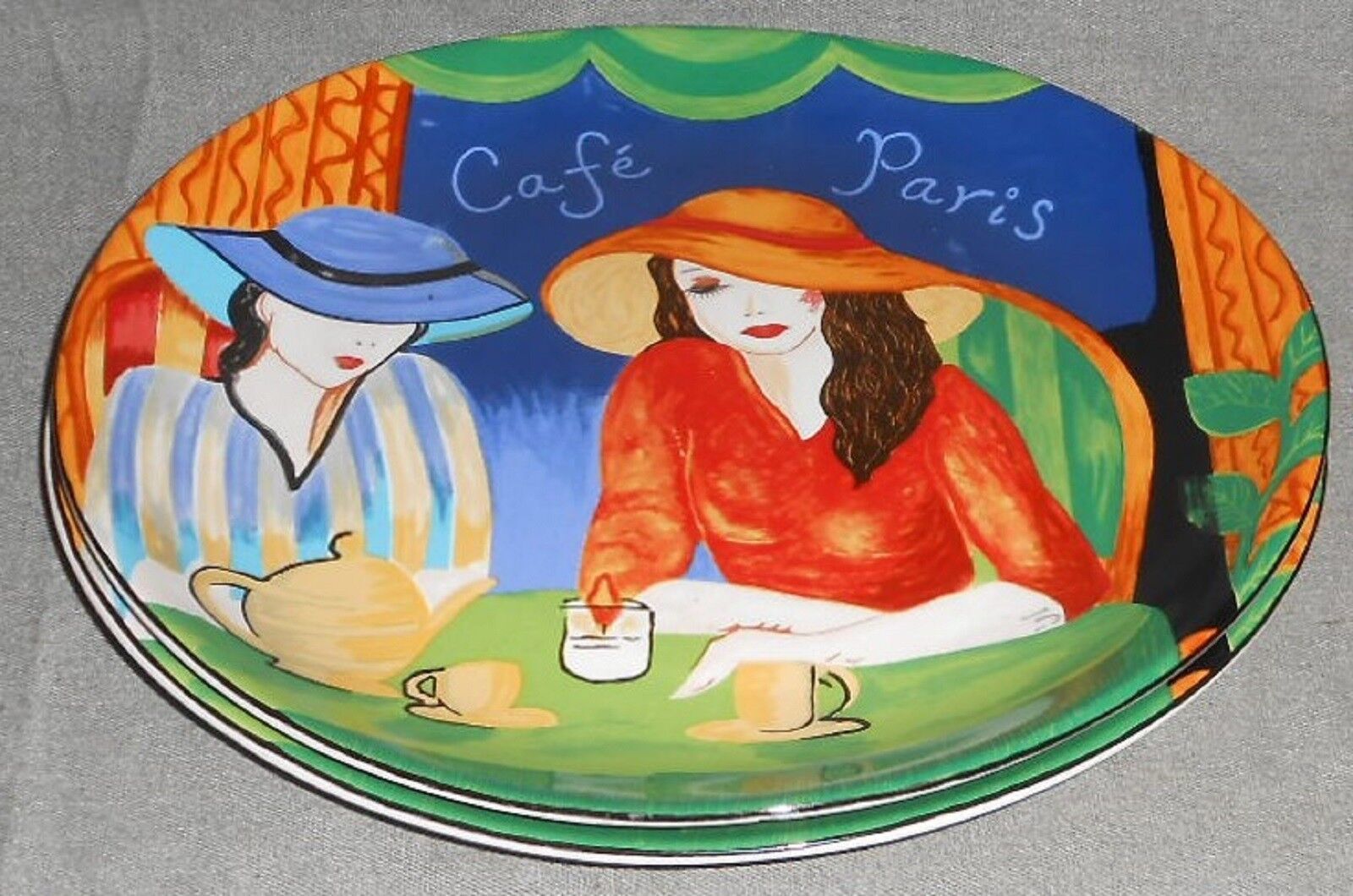 This is a set of (2) 11 1/4" Dinner Plates from 1994 Sango in the Cafe Paris Pattern. They are both in good pre-owned condition with no chips or cracks - some surface usage/wear present - colors in design are bright and vivid - see close up photos above for fine details on each plate.