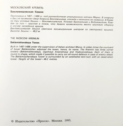 - 1995 Beklemishevskaya Tower Moscow Kremlin Post Soviet Russian Print Card E88C