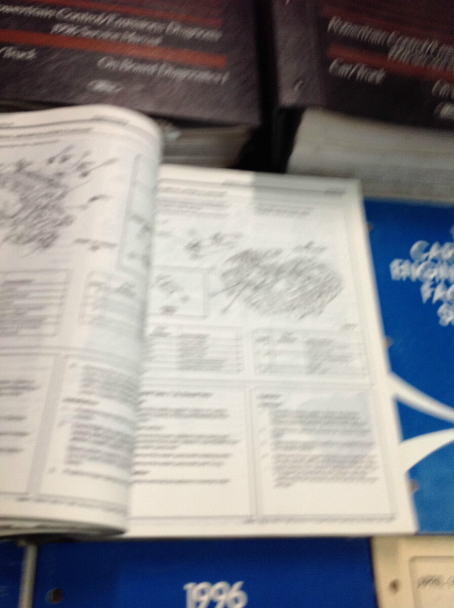 Manuel d'entretien du groupe motopropulseur/transmission Ford F-150/250/350/ Bronco /F-Super Duty 1996 d'usine, manuel d'entretien carrosserie/chassis, manuels de bulletin de service technique, manuel de specifications, manuel d'inspection, manuels de diagnostic des emissions de commande du groupe motopropulseur, manuel de depannage electrique et sous vide, manuel de resume du livre d'information et guide du proprietaire,