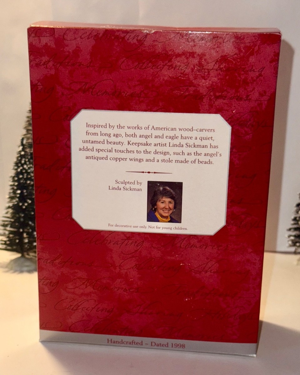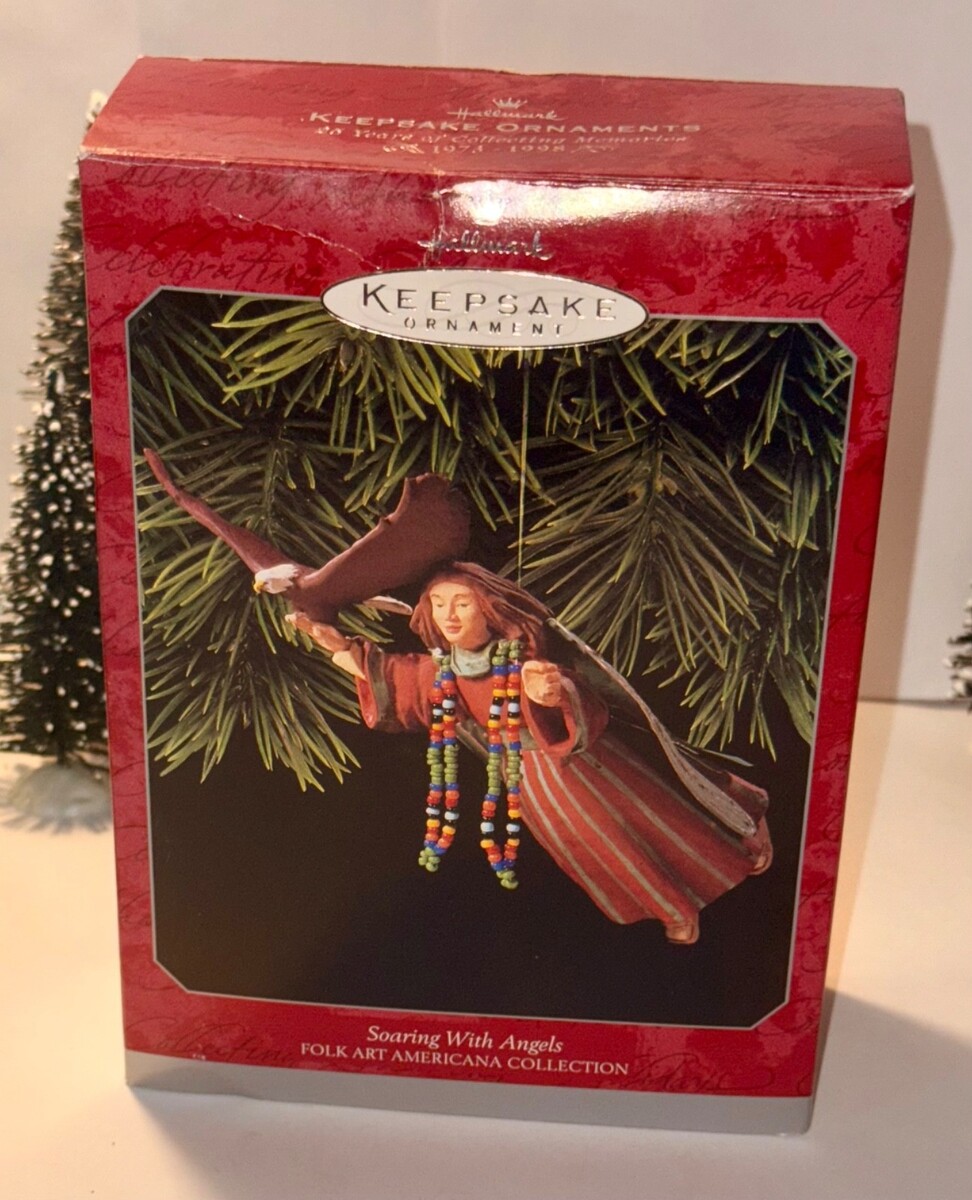 You are bidding on the 1998 Soaring With Angels Hallmark Keepsake Ornament from the Folk Art Americana Collection, celebrating 25 years of Keepsake Ornaments Memories. The ornament is inspired by the American wood-carvers tradition from long ago. Artist Linda Sickman also added special touches including the antiqued copper wings and the beaded stole.