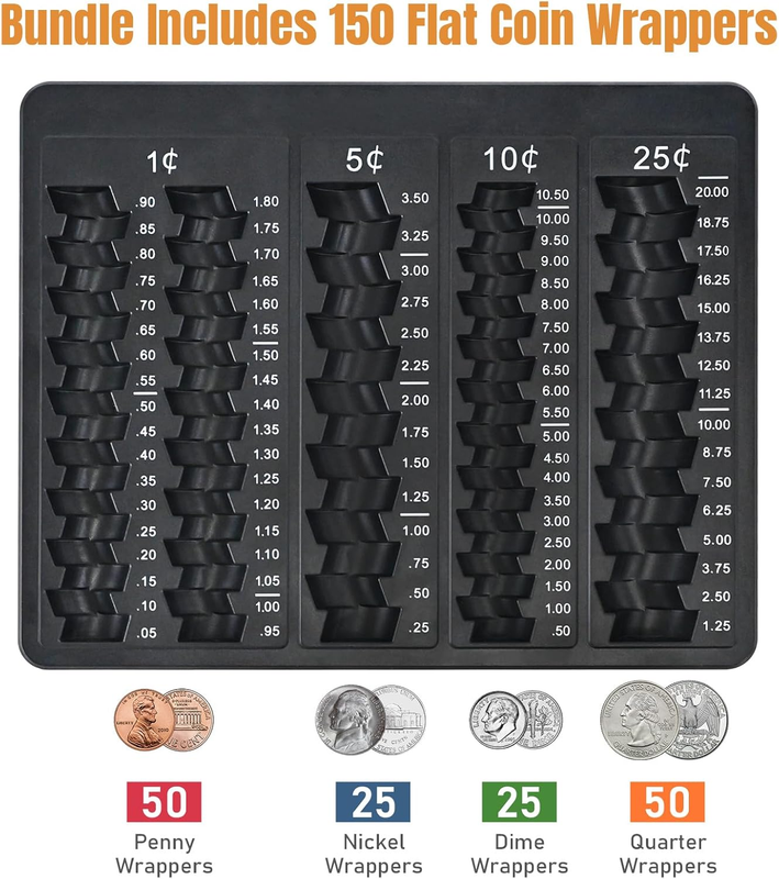 Bundle Includes 150 Flat Coin Wrappers ? 1 pcs coin change count tray and 150 pcs coin rolls wrapper bundle will give you the best value for money organizer count ,coin rolls wrappers are made with high quality heavy duty kraft paper and are distributed by 50 pennies, 50 quarters, 25 nickels and 25 dimes rolls,will help you better keep budget on track