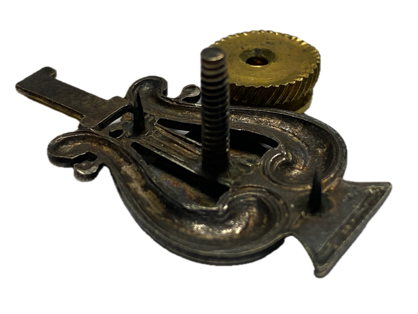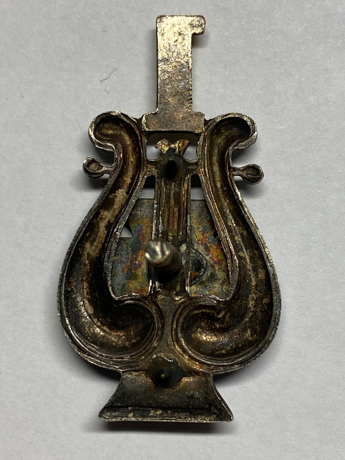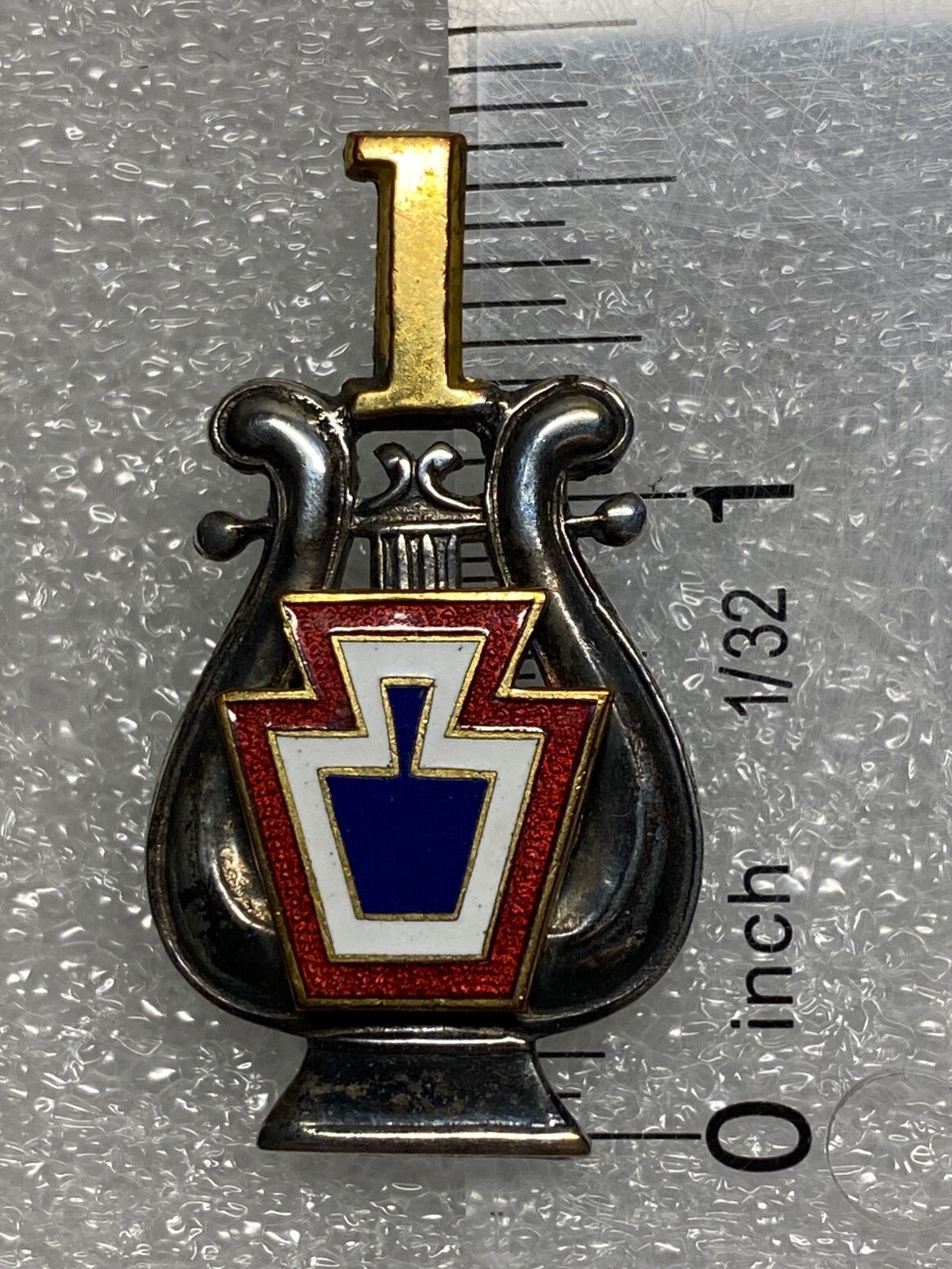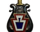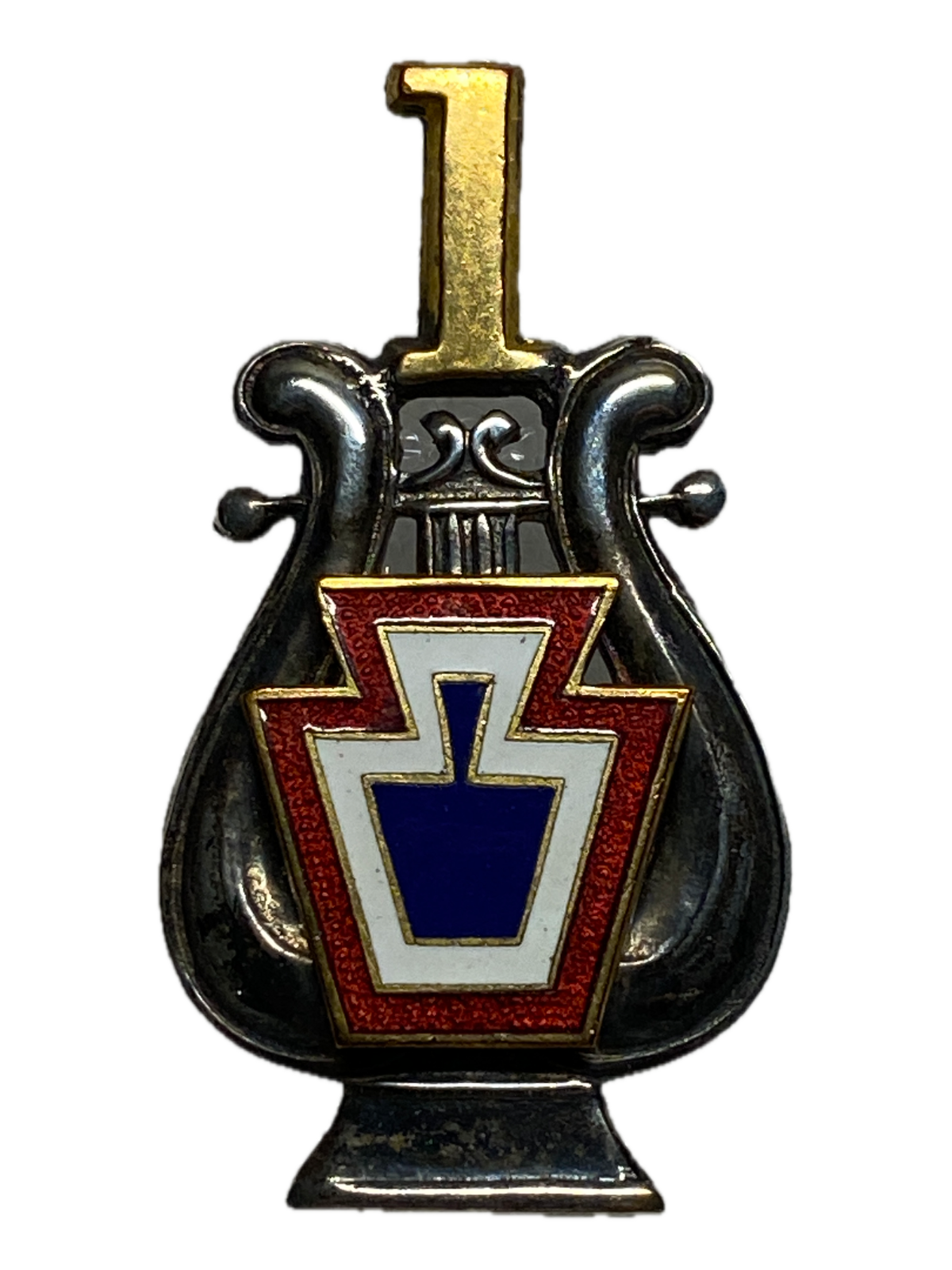 Musicians, Bandsman of the Pennsylvania National Guard wore this hat badge with an enameled red and white and blue keystone having the unit above and the keystone applied to the lyre. Screw back with thumbscrew post. This badge was normally worn centered within a gilt wreath on the cap. Musicians, Bandsman received this new insignia in 1900 that showed their regiment number above a colored keystone. The enameled red and white keystone represents 4th Brigade, Pennsylvania National Guard. These musicians came from the central and south central part of state.