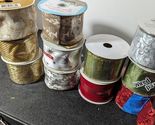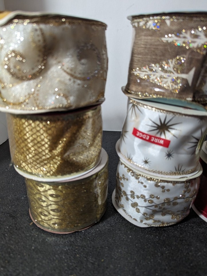 11 rolls of wired edge Christmas ribbon in multiple colors. 9 rolls still have the factory plastic on them. 2 rolls the plastic has come off but they appear to be full or nearly full rolls. Am selling all as one lot.