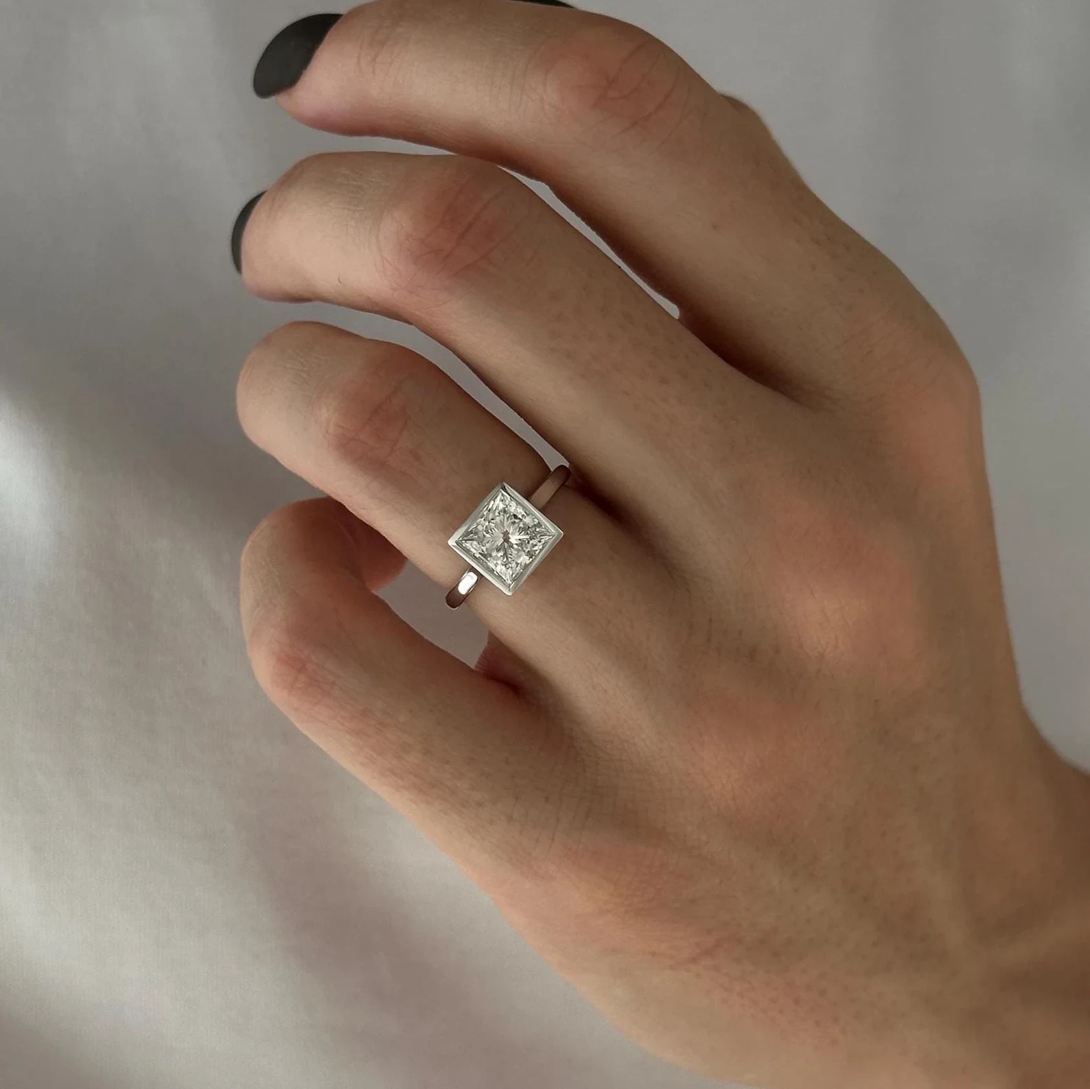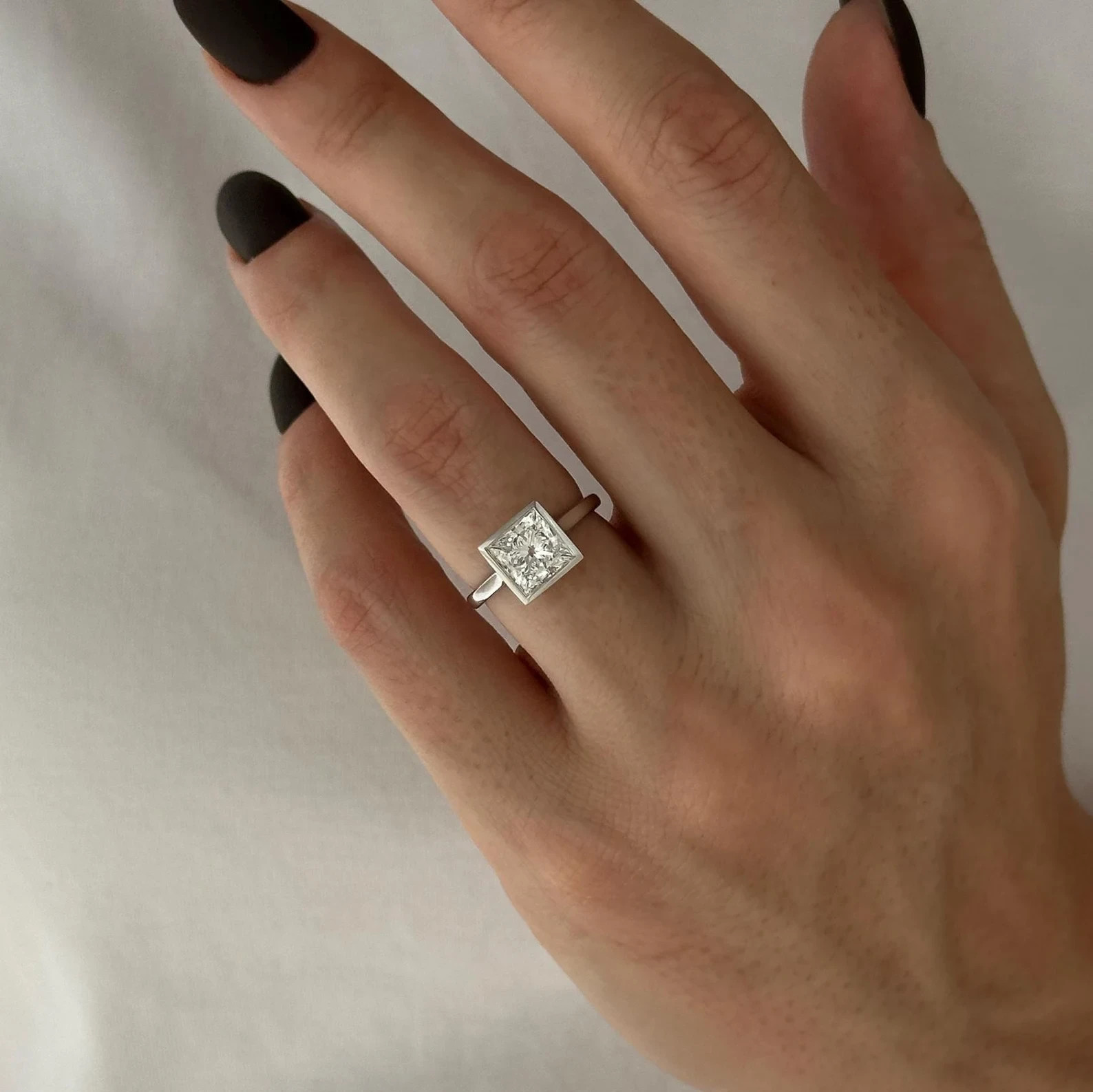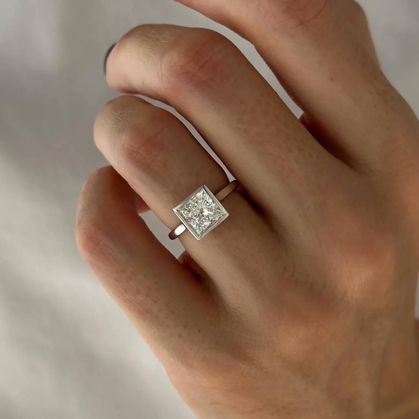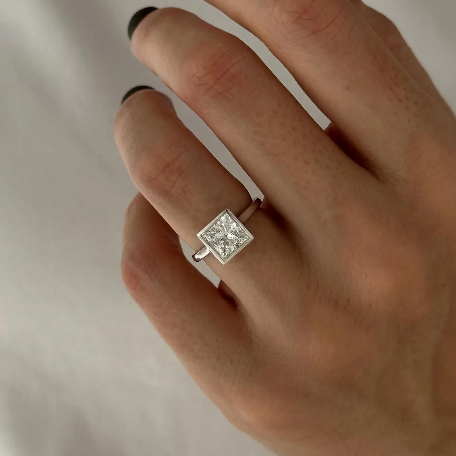 - 2 Ct Princess Cut E VVS2 Lab Grown Diamond Bezel Set Solitaire Engagement Ring