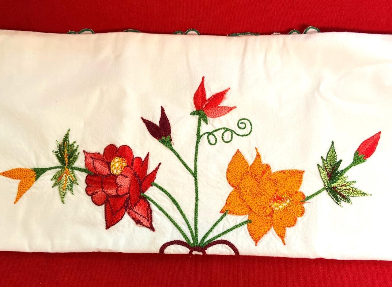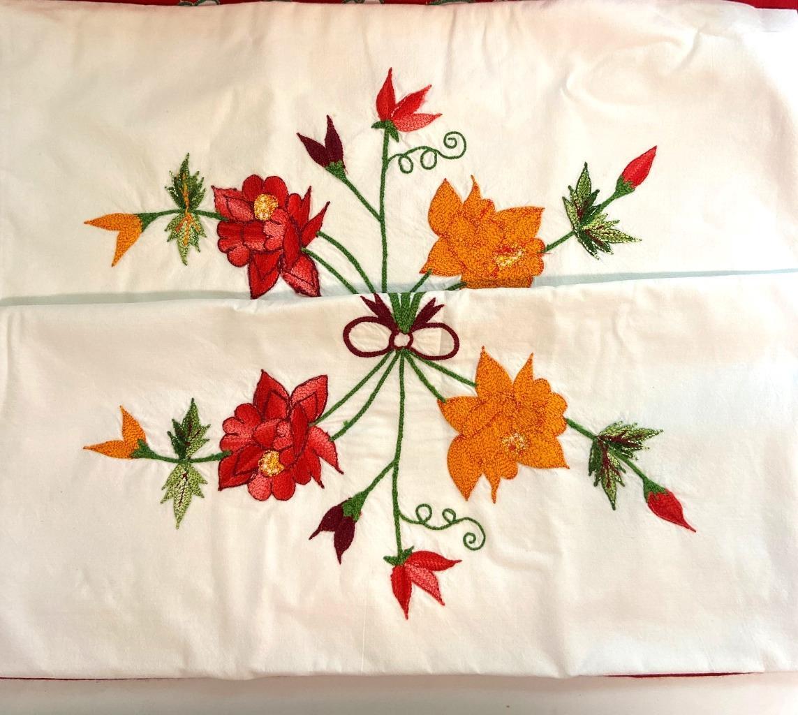 2 Embroidery Pillowcases w Green Stitched Scallop Edges Floral Design