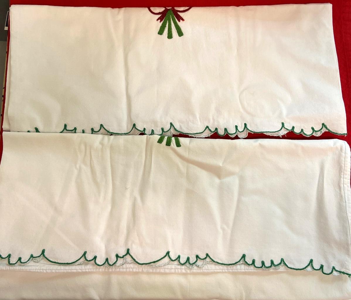 - 2 Embroidery Pillowcases w Green Stitched Scallop Edges Floral Design