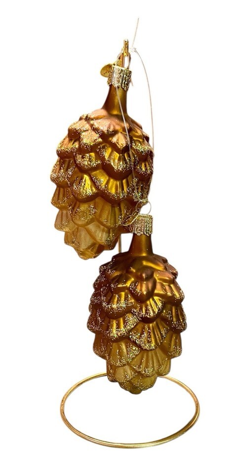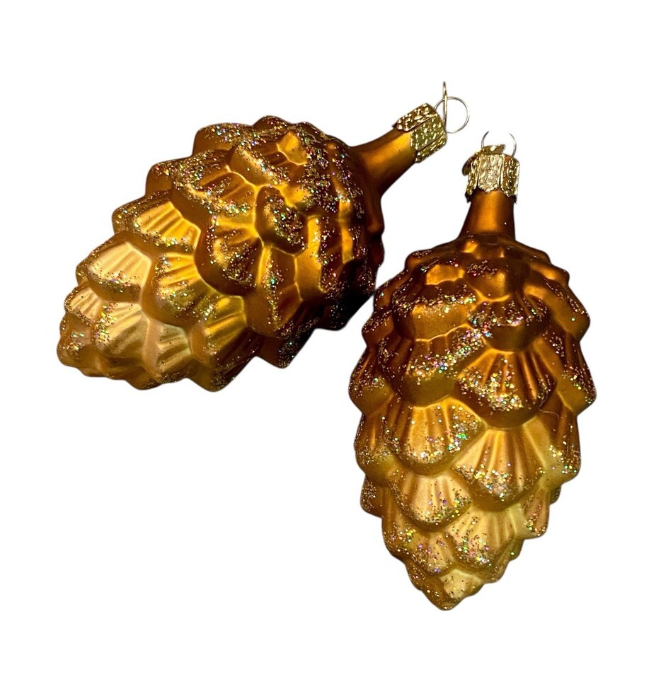 2 Glass Pinecone Christmas Ornaments Pair Glitter Gold Copper Bronze Nature