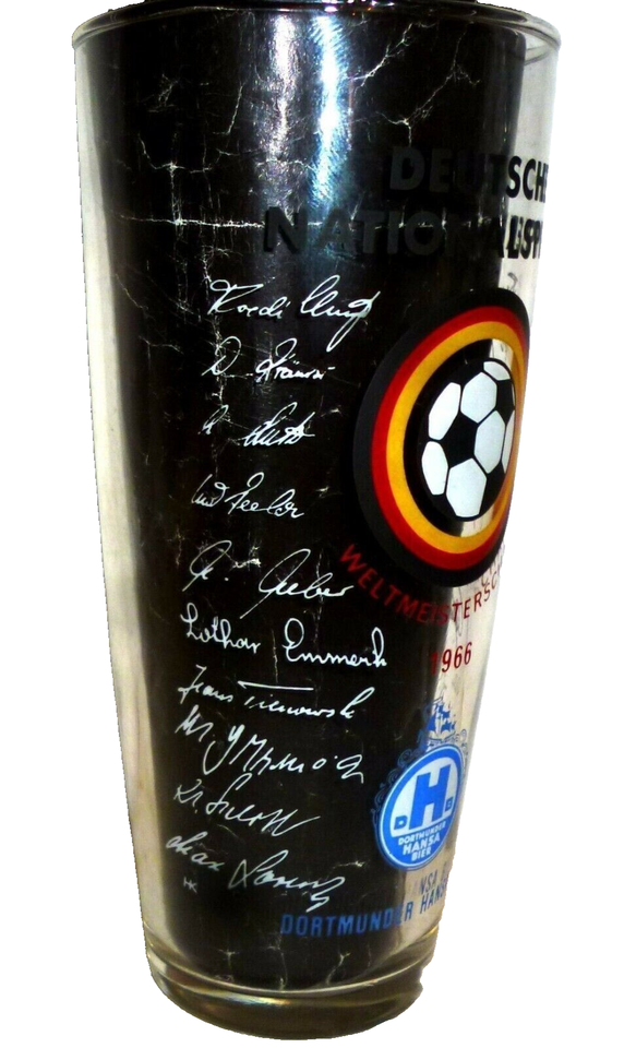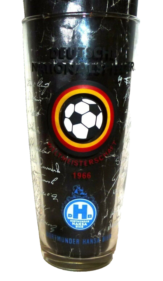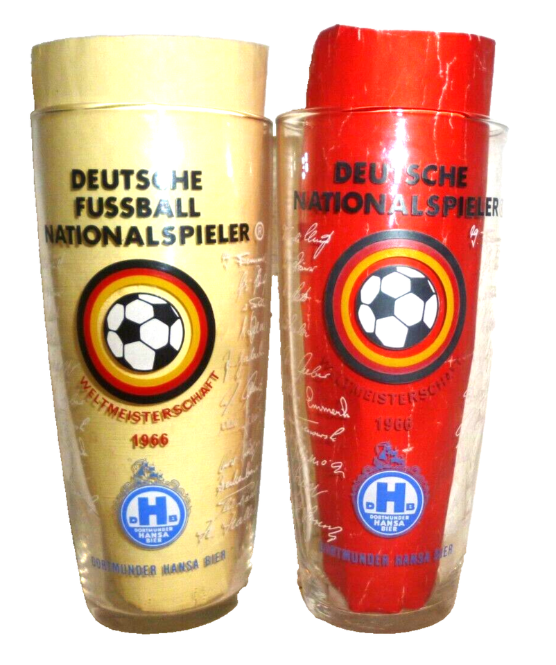 For sale is a wonderfull Set-of-2 rare, vintage, limited-edition 1966 Soccer WorldCup England beerglasses from the Hansa brewery in Dortmund, Germany, displaying engraved autographs of the full German National Team with such legendary players like Franz Beckenbauer, Uwe Seeler, Wolfgang Overath, Helmut Haller, Lothar Emmerich, Hans Tilkowski, Karl Heinz Schnellinger, Wolgang Weber, Schulz etc.