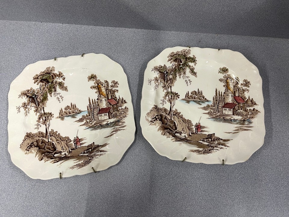 2 Johnson Brothers ?THE OLD MILL? SQUARE SALAD PLATES 7 3/4 in. (England). with plate hanger