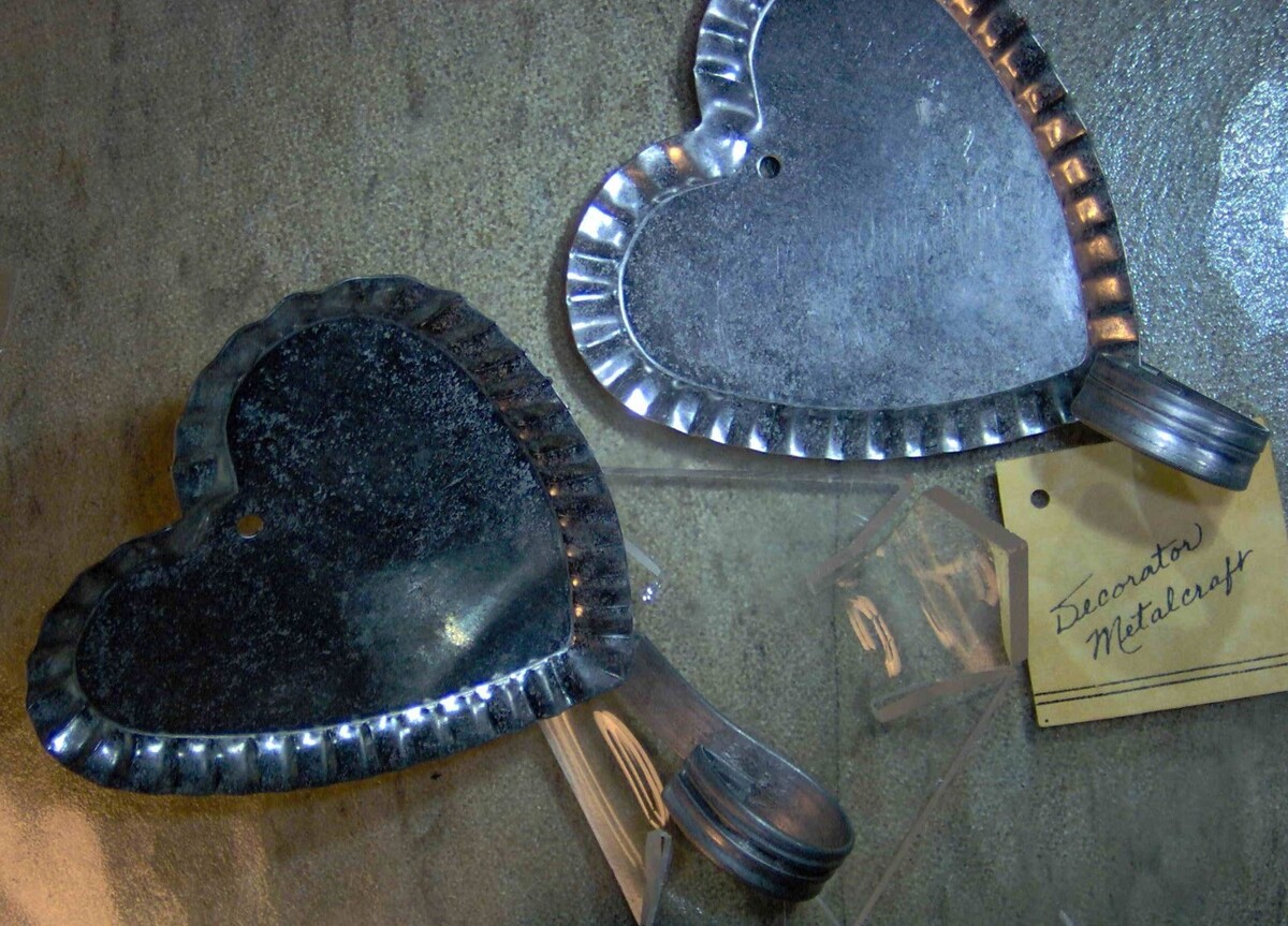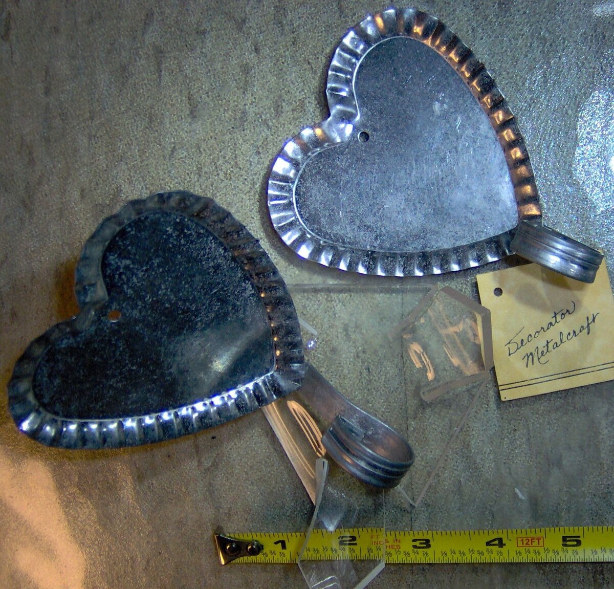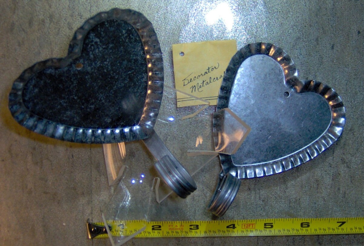FOR SALE ARE TWO (2) VINTAGE NEW 3 1/2" TIN METAL HEART CANDLE HOLDER DECORATIVE WALL SCONCES. PULLED FROM ESTATE, STILL IN FACTORY BAG, LIKELY 20-40 YEARS OLD. THIS DECORATIVE METAL CRAFT SCONCE IS TYPICALLY HUNG ON THE WALL, AS DECORATION, NOTE HOLE IN DRIP PAN FOR A PUSH PIN OR SILVER HEADED NAIL. THESE TWO (2) MATCHING PIECES ARE MADE OF 100% TIN METAL WITH A HEART DESIGN MEASURING 3 1/2" AT WIDEST POINT. THESE ARE AT LEAST 20 YEARS OLD PULLED FROM ESTATE, MORE DECORATIVE AND CRAFTY THAN UTILITARIAN. NEW AND NEVER USED, STILL IN FACTORY PACKAGING. EACH IS 100% METAL TIN CONSTRUCTION. THESE ARE FOR DECORATIVE USE ONLY. THIS TIN METAL THEM IS OFTEN USED IN THE SHABBY CHIC THEME. RECEIVE TWO (2) HEART SHAPE TIN METAL CANDLE HOLDER SCONCES, AS PICTURED, SHIPPED BY USPS....