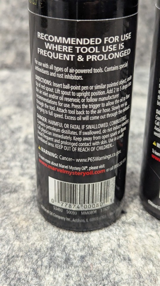 2 x Brand new and unused Marvel MM080R Air Tool Oil 4 oz. Bottle . Only taken out to check its condition and for pictures. No damage to it as shown in the pictures.