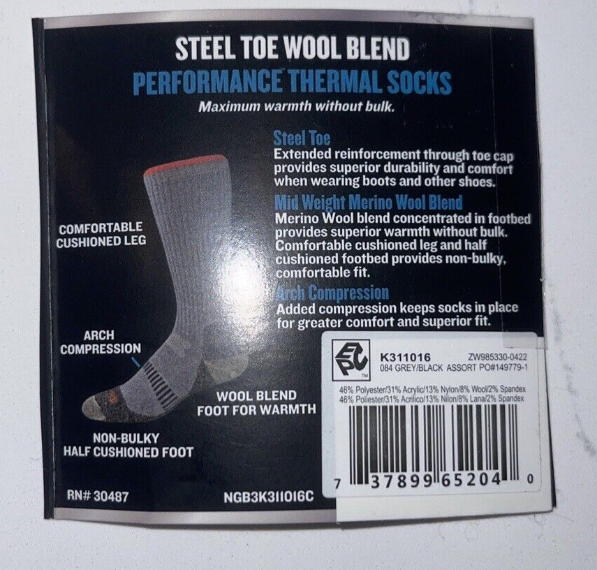 - 2 PAIRS Dickies Steel Toe Crew Performance Thermal Wool Blend Gray SOCKS 6-12