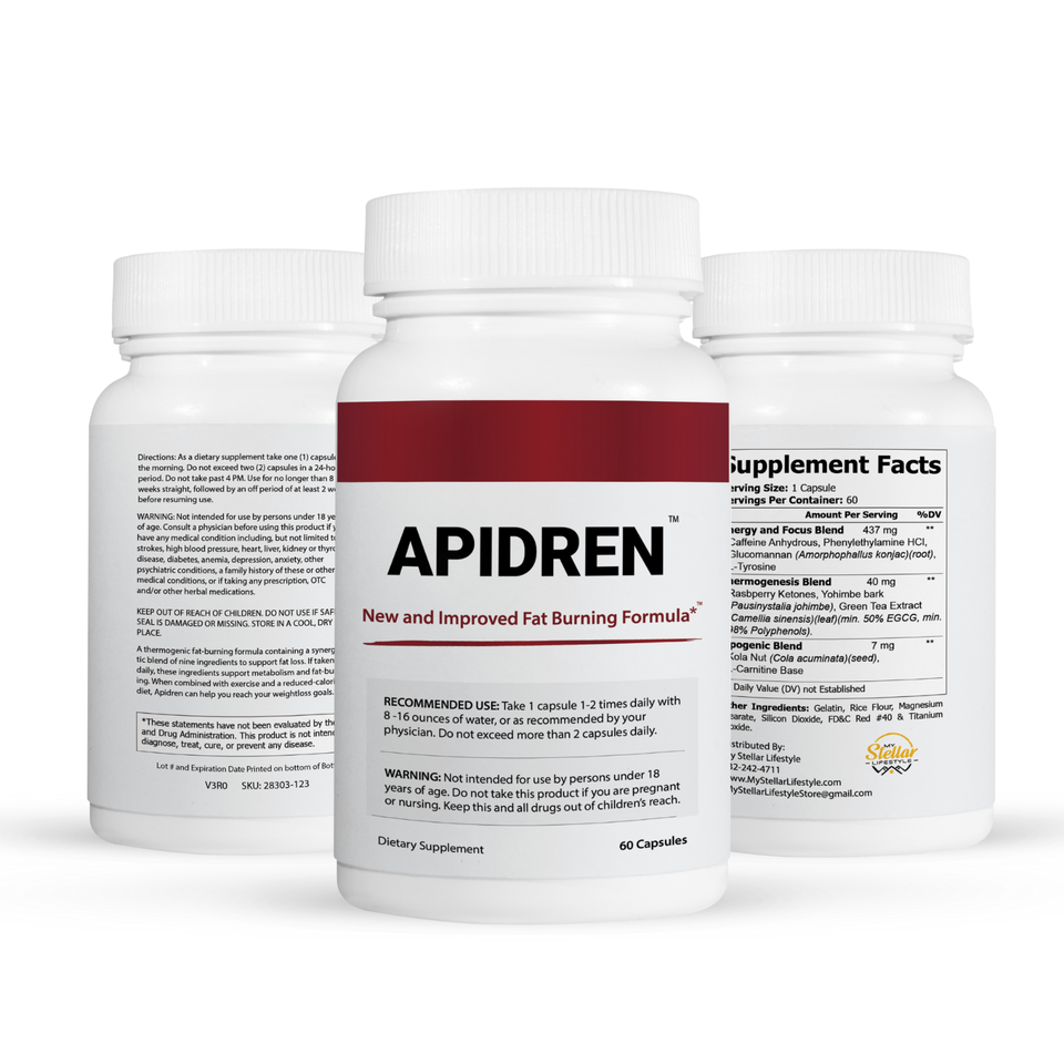 Apidren is a thermogenic fat burning formula that contains a synergistic blend of nine ingredients to support fat loss. Taken daily, these ingredients support metabolism and fat burning. When combined with exercise and a low calorie diet, Apidren can help you achieve your weight loss goals.