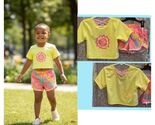 #1036...."Body Glove".... yellow crop top and pink floral shorts, children's activewear. The top is short-sleeved with a criss-cross strap design at the back and features a pink floral logo with the words "GOOD VIBES" inside. The shorts have an elastic waistband and a floral pattern in shades of pink, orange, blue, and green. lightweight and comfortable, suitable for warm weather or physical activities......
