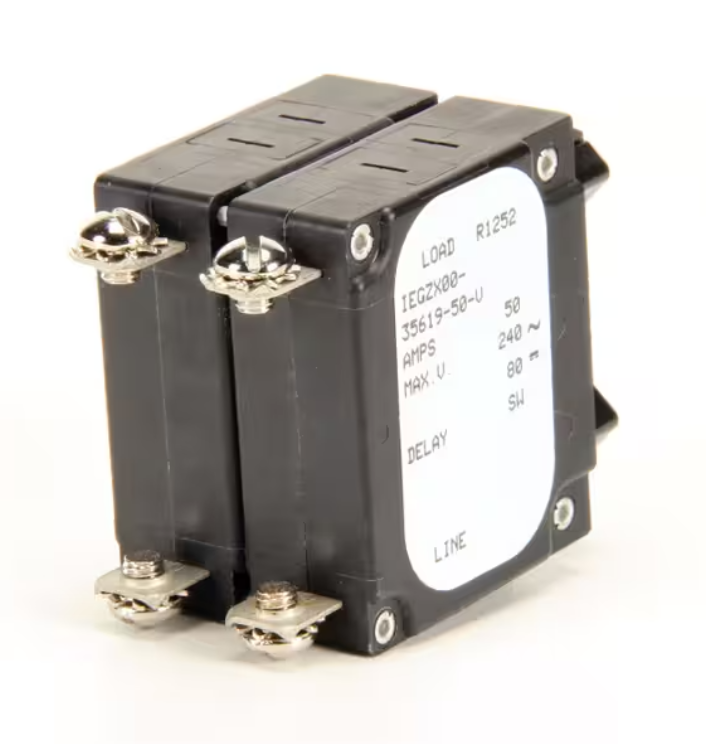 Ensure safe and reliable power management with this 2-Pole 50A Rocker Switch / Circuit Breaker, compatible with Nieco part number IEGZX00-35619-50-V and R1252 Power Control Units. This dual-function component acts as both a power switch and circuit protection device, providing vital safety for commercial broilers and cooking systems.