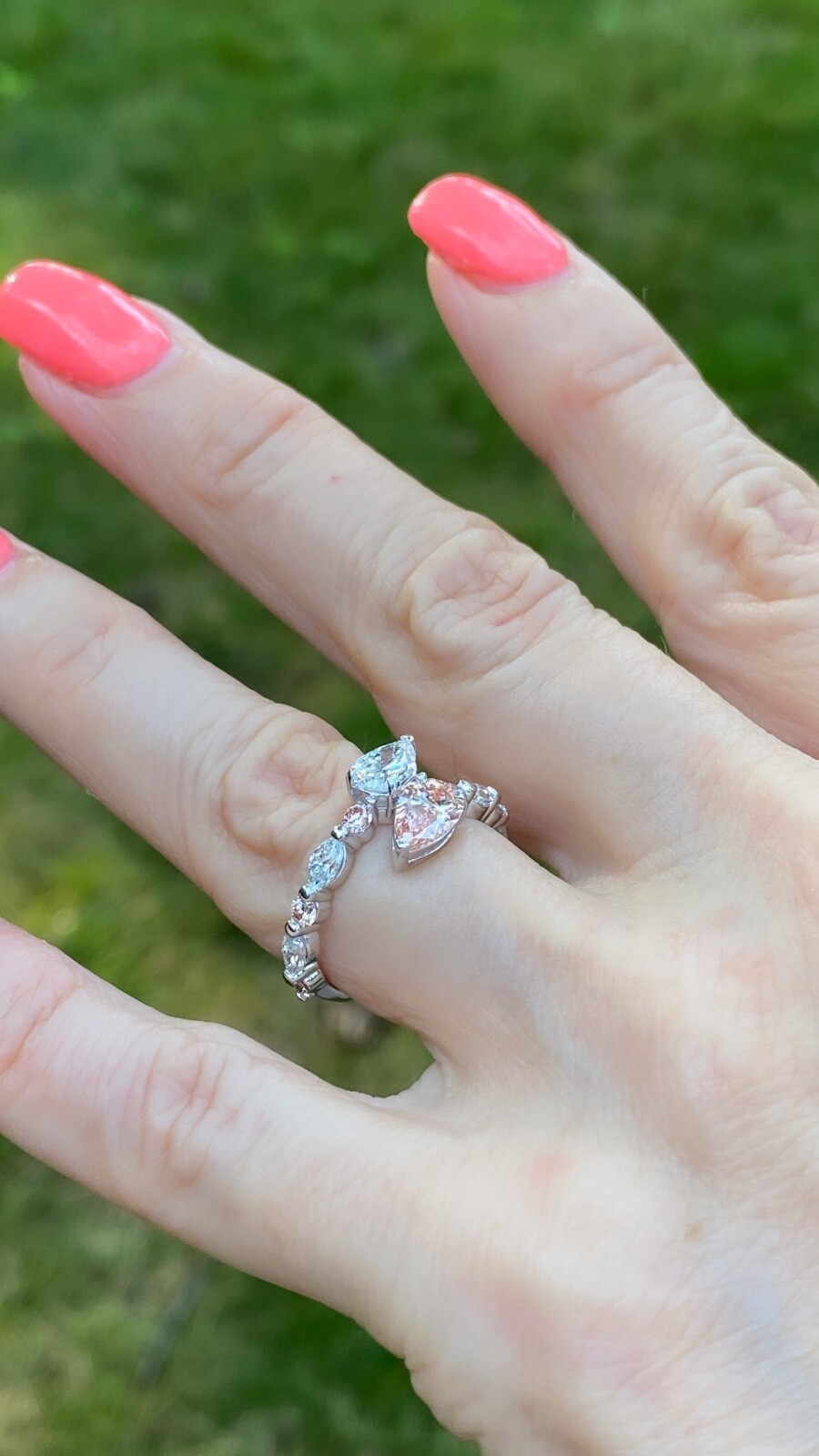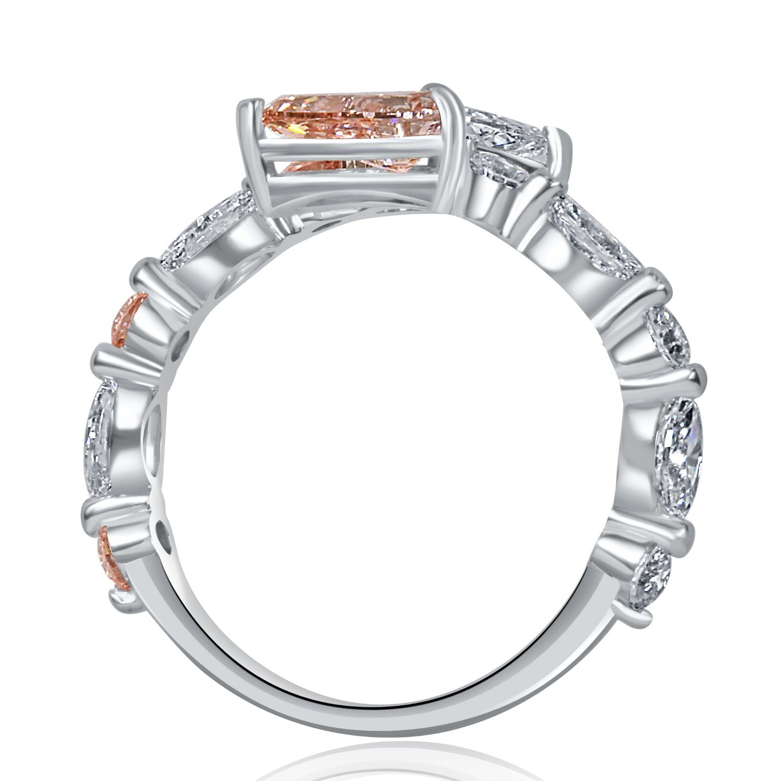 Celebrate the beginning of a beautiful life together with this pear brilliant cut lab grown white and pink diamond ring! This modern bypass design diamond ring features 1.12 carat 2 pear shaped lab grown diamond surrounded by of round brilliant cut and pink diamonds in prong setting. Crafted of 14k white gold, the ring has a total diamond weight of 2.02 carats. The bypass ring is the perfect alternative to the classic engagement ring.