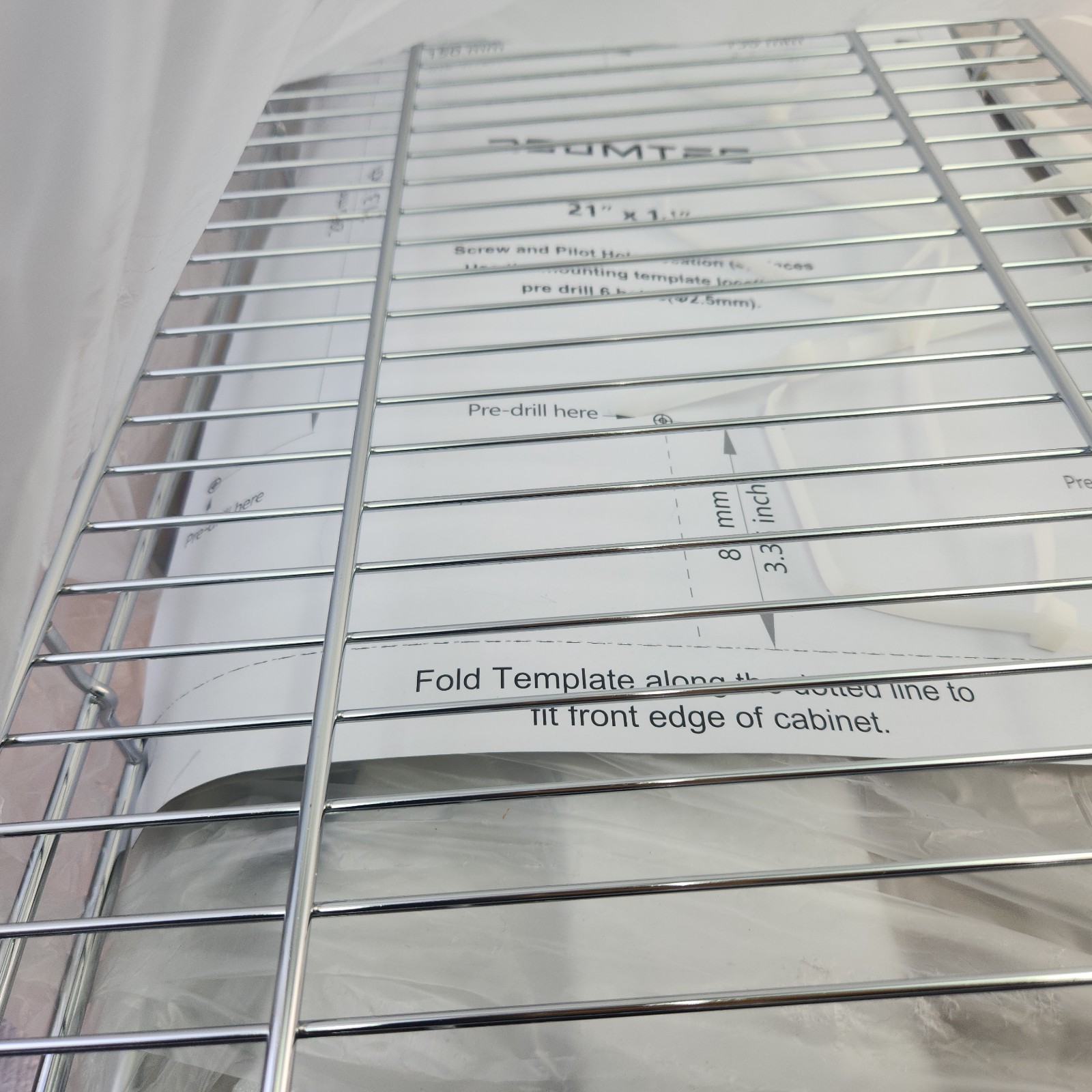 The product is a 2-tier pull-out kitchen cabinet storage organizer made of stainless steel, measuring 21 inches in length and 14 inches in width. It features two rectangular compartments, perfect for storing pot and pan lids. The sliding shelves are easy to install, waterproof, and easy to clean, with a high load-bearing capacity. The modern design includes a cabinet-mounted rack insert, making it a convenient and practical addition to any kitchen. Made in China, this organizer comes in a sleek silver color and includes two shelves for optimal storage space.