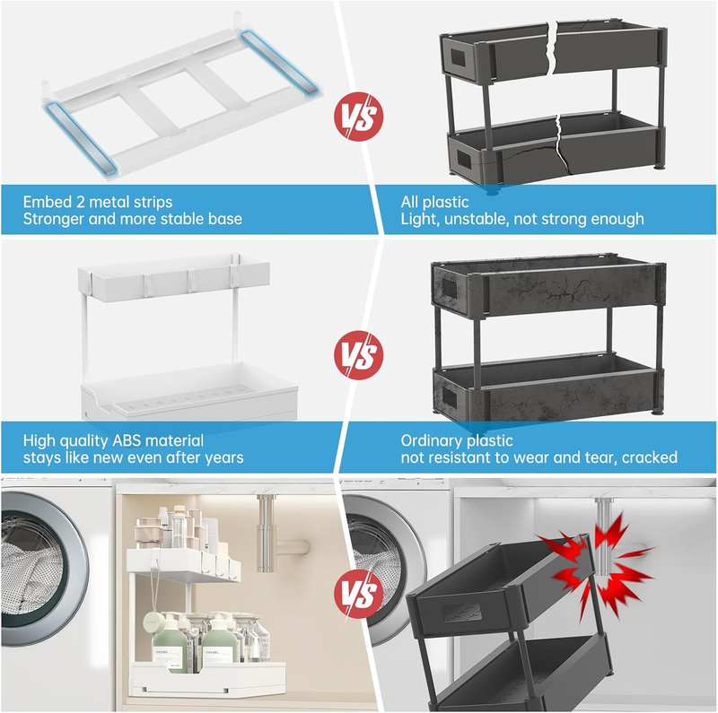 Good Quality and Multi-purpose Organization and Storage, our under sink organizer perfect fit the under sinks, bathrooms, cabinets, countertops, kitchens, food pantries, offices, laundry rooms and other places