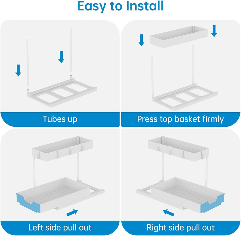 Easy to Install and Clean, only takes 3 mins to install this slide out cabinet organizer, the sink shelf is grid design to prevent water accumulation, also effortless to clean, simply wipe the surface with a damp cloth
