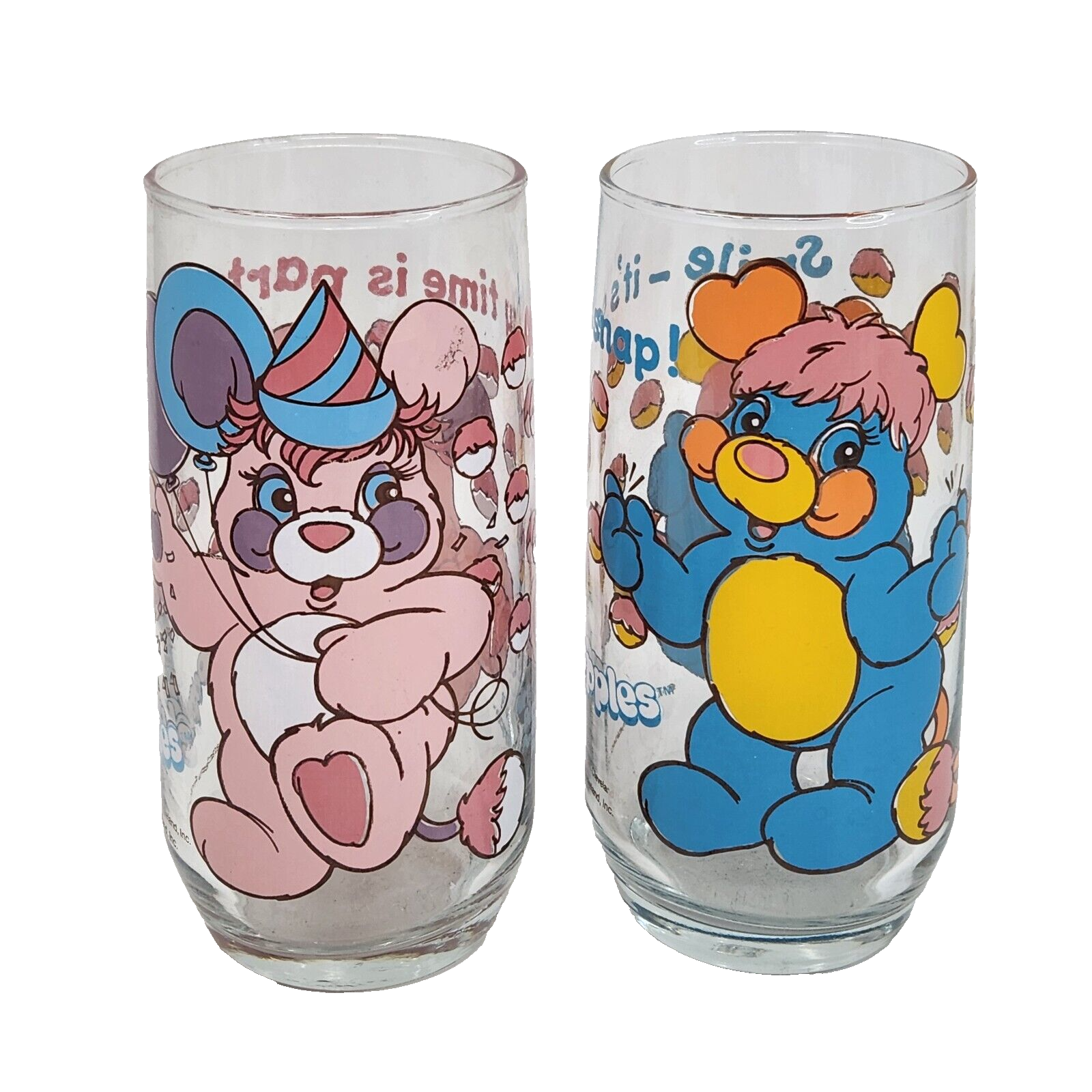 2 VINTAGE 1986 POPPLES GLASSES PINK PARTY + BLUE PC POPPLE PIZZA HUT GLASS CUP