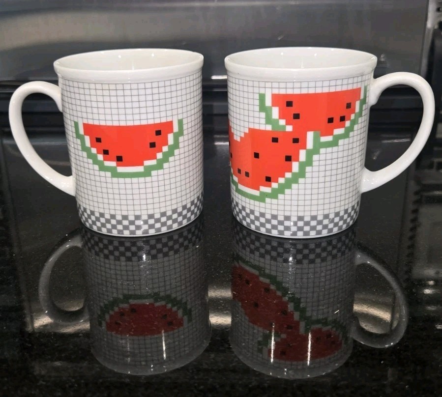- 2 Vintage 90s Pixel Watermelon Coffee Mugs - Digital, Computer,