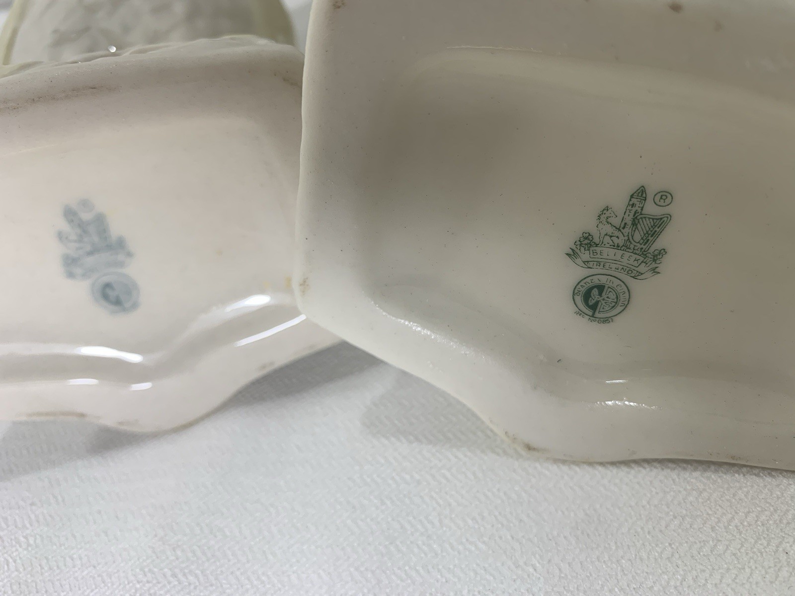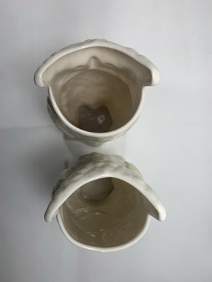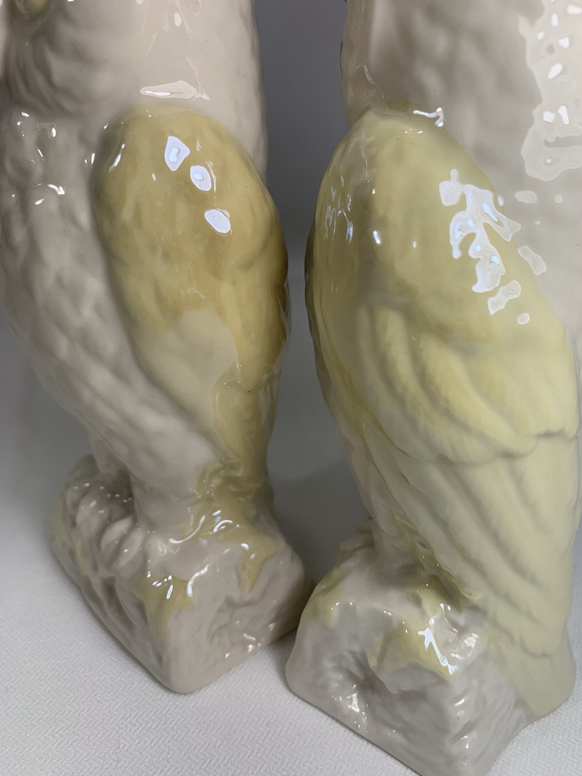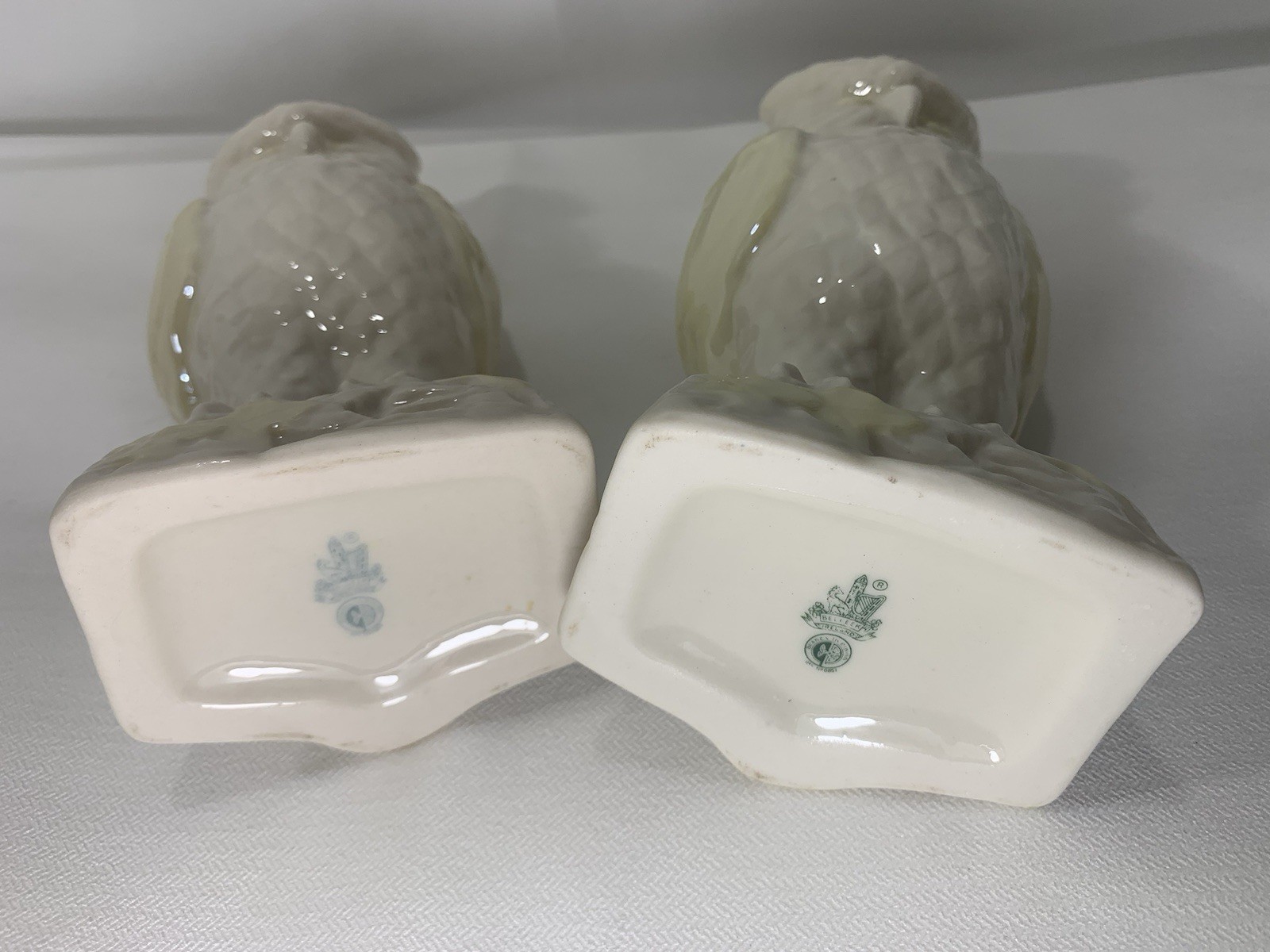 This is a neat pair of vases, in the shape of owls. Made by Belleek Pottery established in 1857 in County Fermanagh, Ireland. It is known for its thin, iridescent Parian ware. The backstamp features a harp, a wolfhound, and a round toer, symbols of Ireland. The specific mark in the image dates from 1946-1955.