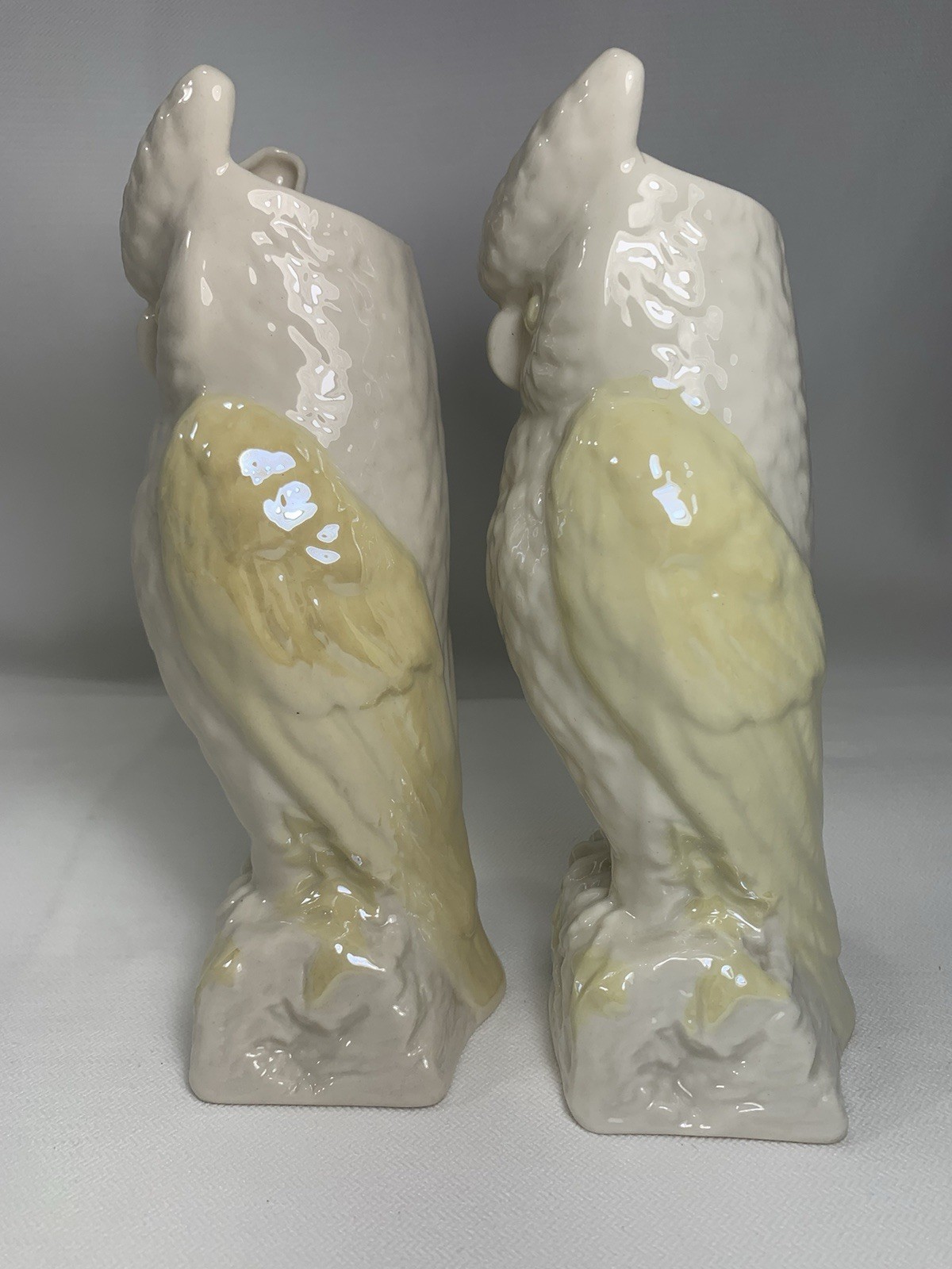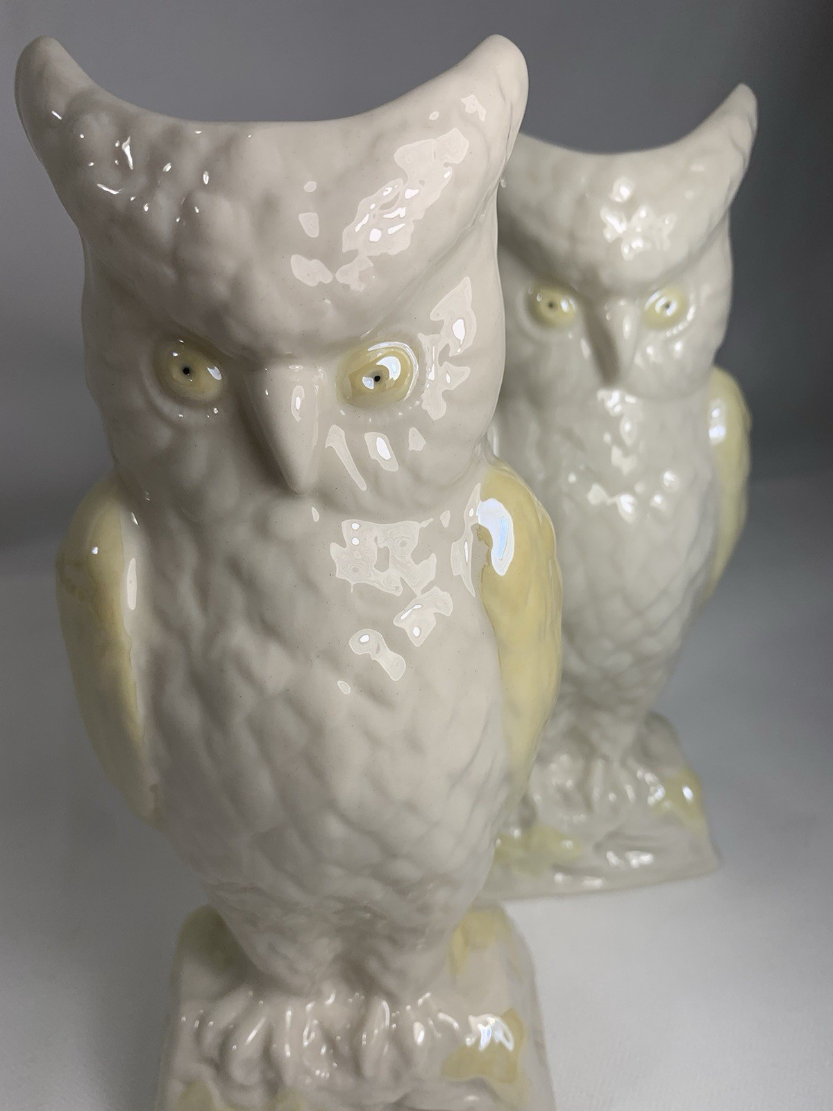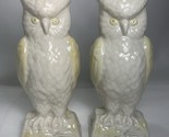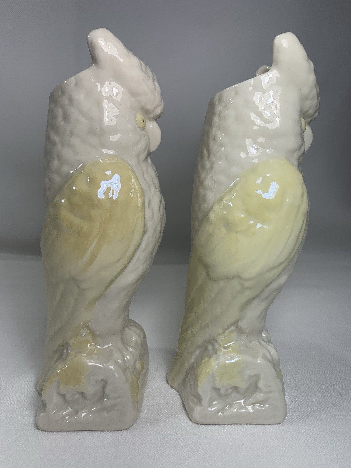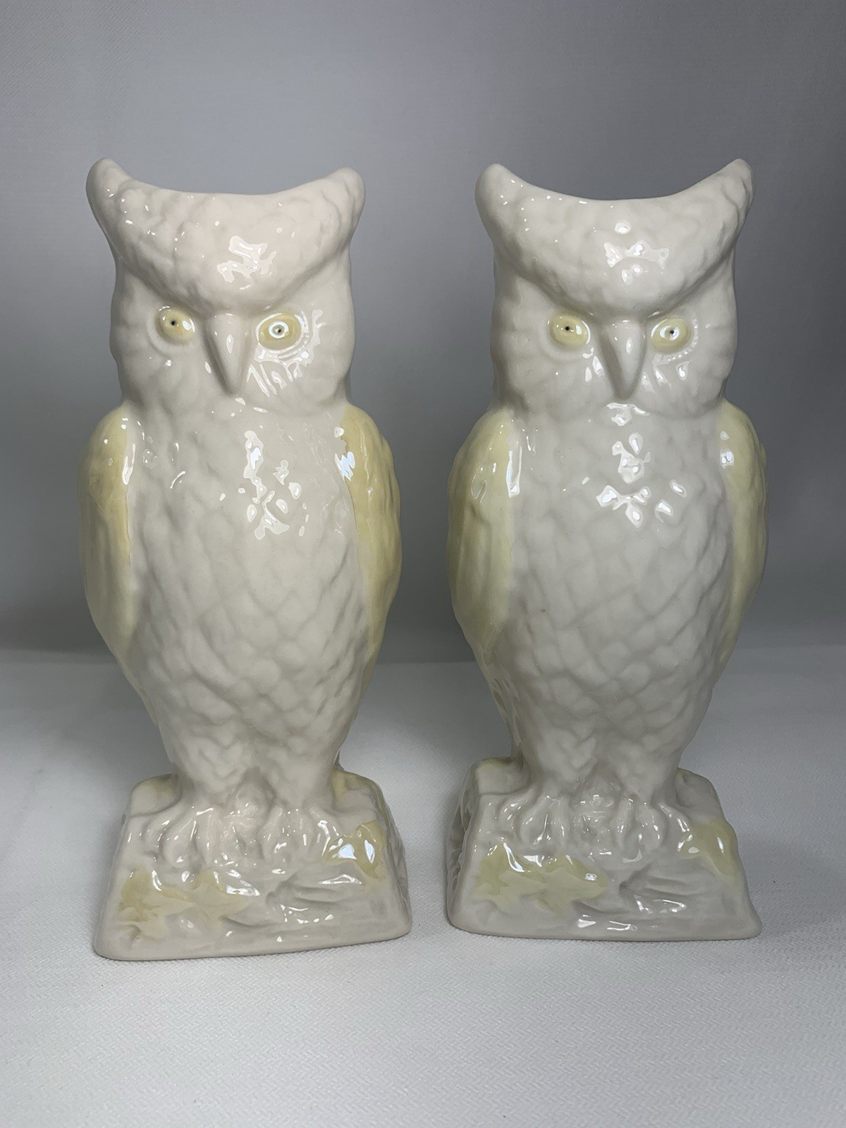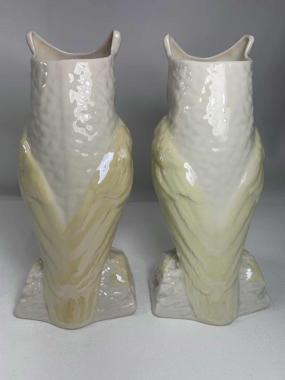 - 2 VINTAGE BELLEEK LUSTRE OWL CREAM PALE YELLOW VASE Gold MARK 8.5" IRELAND