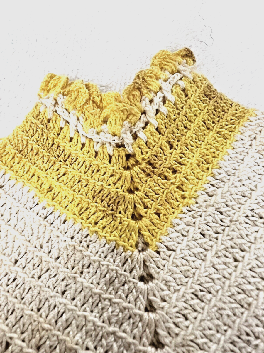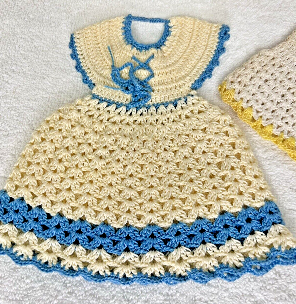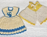 - 2 Vintage Hand Crocheted Dress & Underwear Potholder Set Blue Yellow Cream
