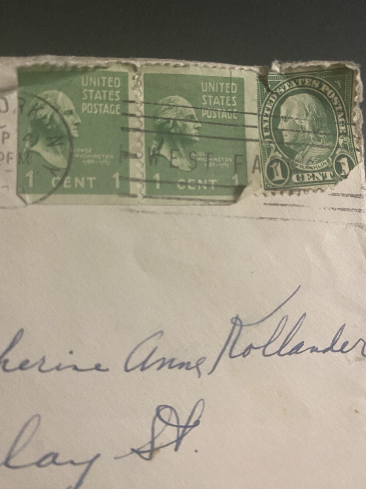 2 Washington 1 cent green stamps and 1 Benjamin Franklin 1 cent stamp green on cover. Cover contents remain with cover