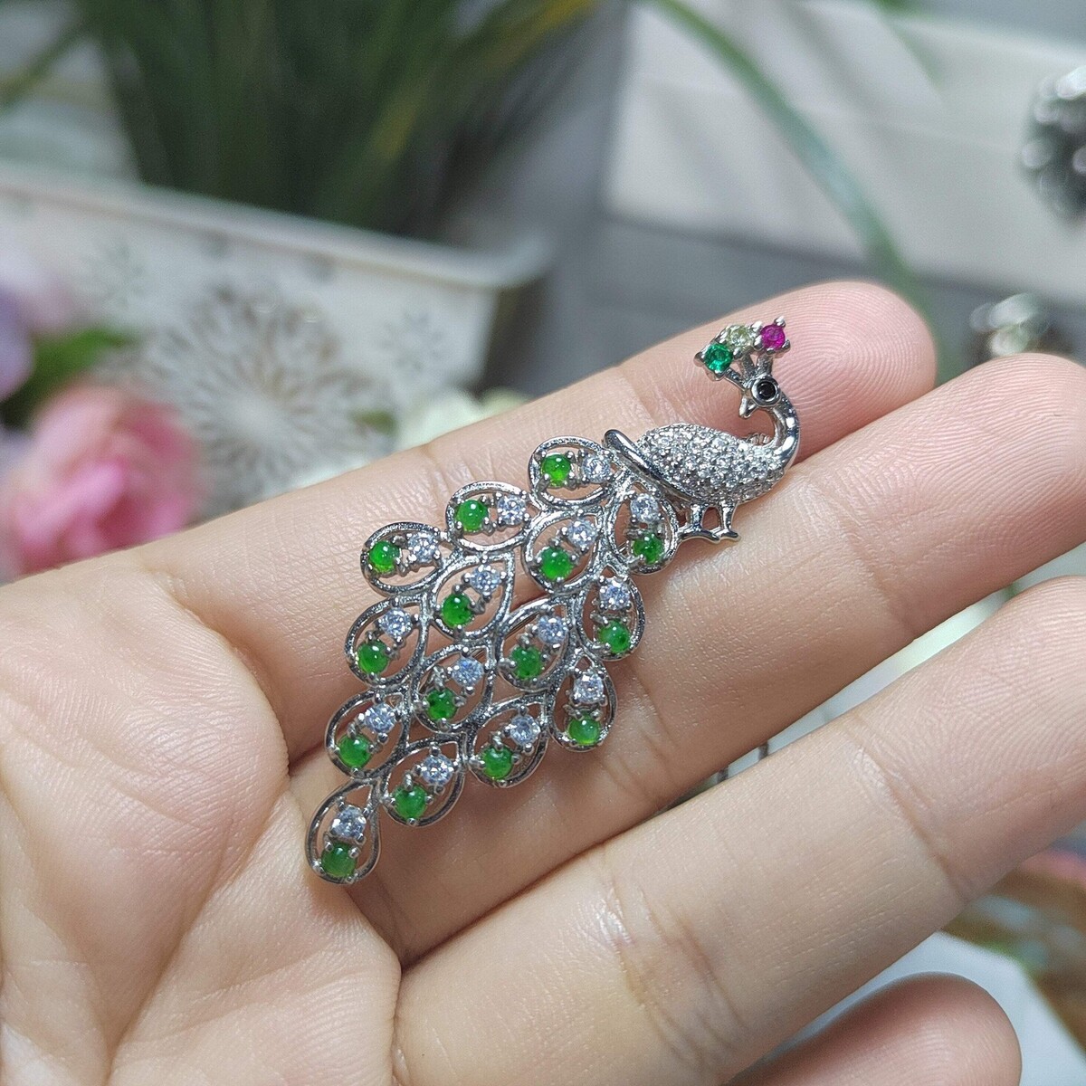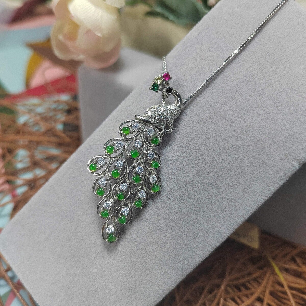 Experience this Bright Apple Green 15pcs Pendant/Brooch Untreated Jadeite with Zirconia S925 Sterling Silver settings pendant very creative but elegant design. Details: Color: Bright Apple Green Pendant Dimensions: 49.6mm x 21mm x 2.7mm(with setting) Chain Length: 45cm Chain: 925 Sterling Silver - 18K White Gold Plated Whether worn for a special occasion or as an everyday piece, this jadeite pendant is sure to draw admiration and compliments. Packing Includes: Silver Cleaning Cloth Jadeite Treatment Oil Jewelry Pouch Jewelry Box Care Instructions: To ensure your jadeite pendant retains its beauty for years to come, please follow these care instructions: Avoid Chemicals: Keep the pendant away from harsh chemicals such as perfumes, hairsprays, and cleaning agents, as they can damage the jadeite and tarnish the gold plating. Store Safely: Store the pendant in a soft pouch or jewelry box to prevent scratches and exposure to dust. Clean Gently: Clean the pendant with a soft, damp cloth. Avoid using abrasive materials or harsh cleaners. Wear with Care: Avoid wearing the pendant during strenuous activities or while swimming to prevent damage. Regular Maintenance: Periodically check the pendant for any signs of wear or damage and take it to a professional jeweler for maintenance if needed.