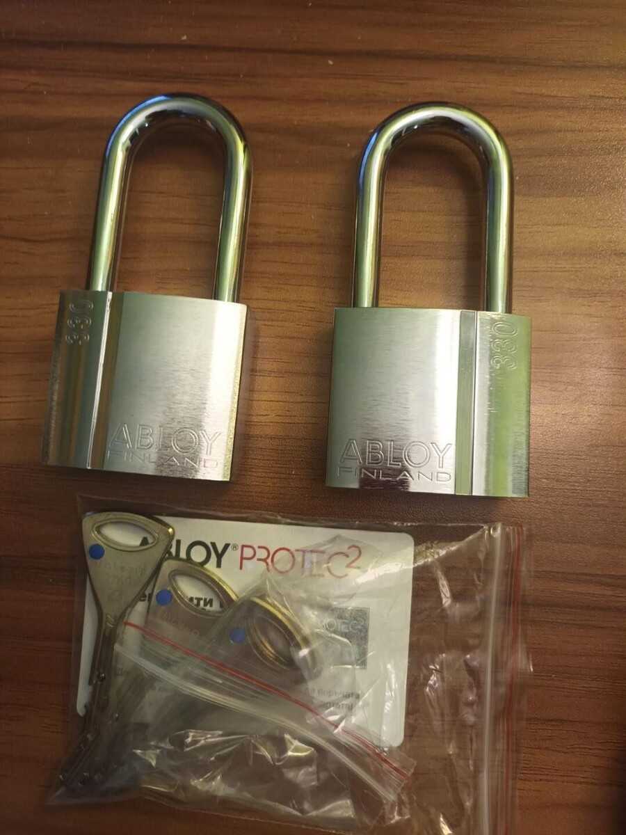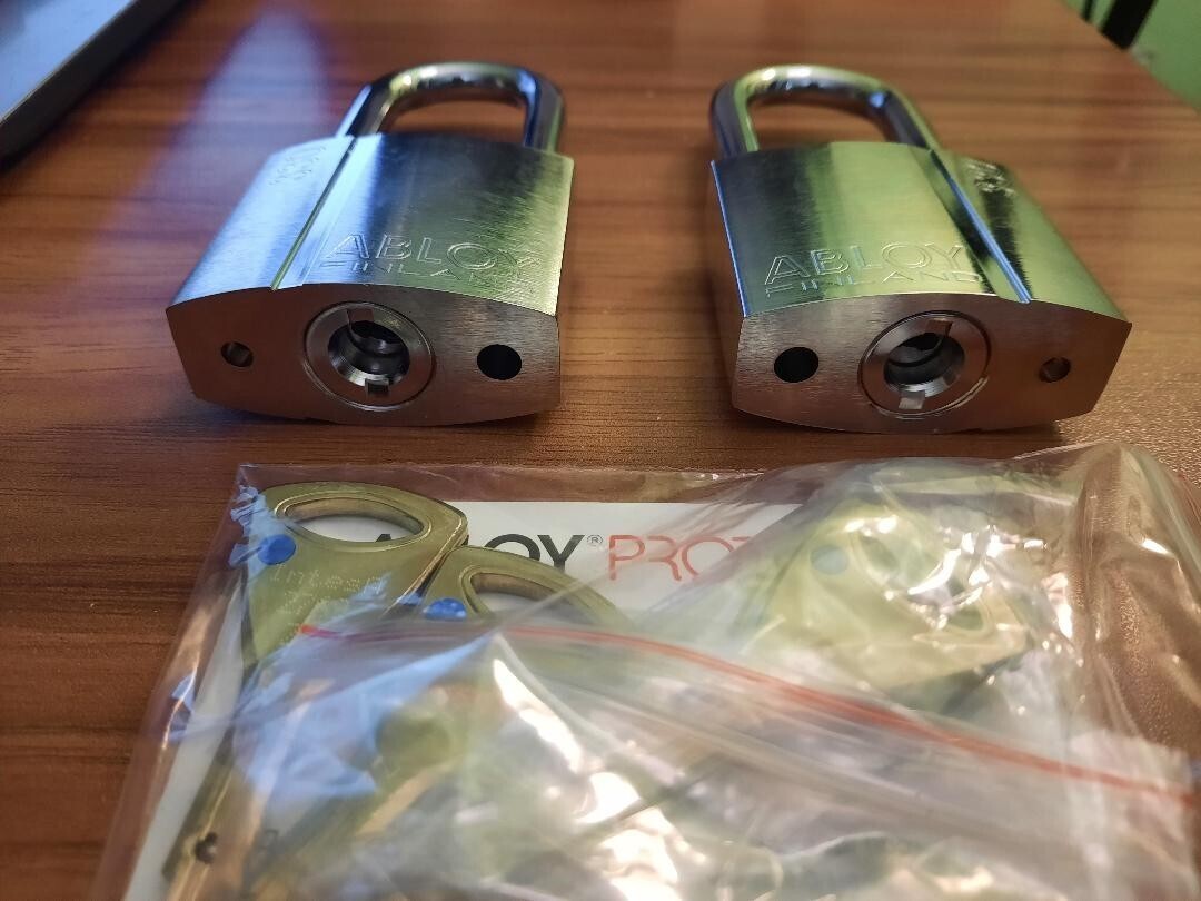 Two keyed alike padlocks ABLOY PL330 T with 4 keys total and 1 keycode card for the both padlocks
