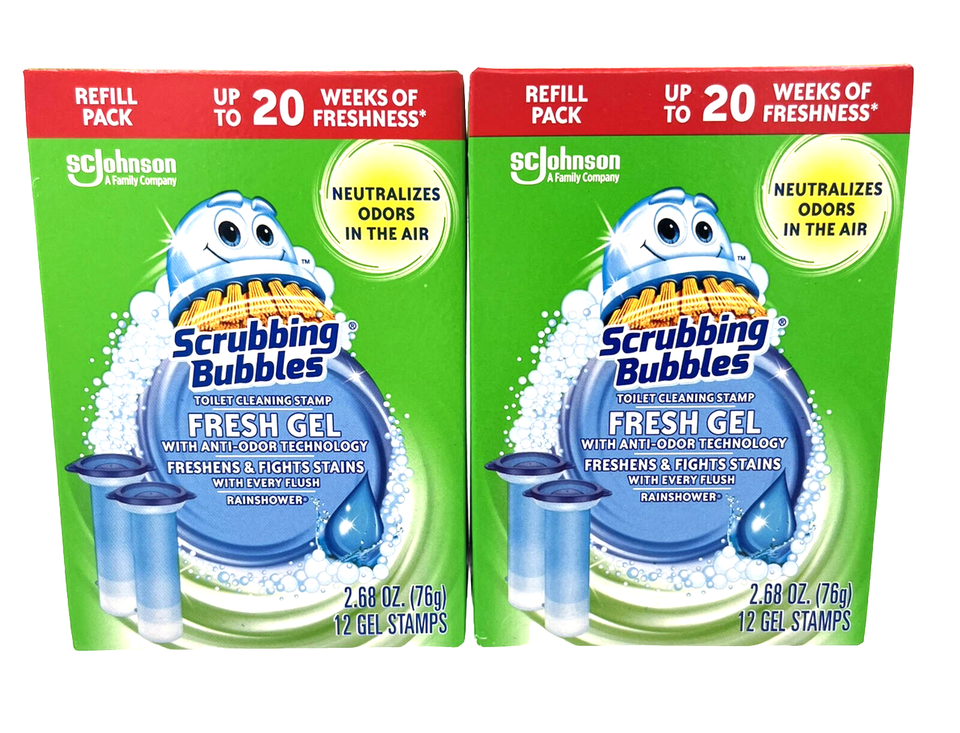 - 2 X Scrubbing Bubbles Rainshower Toilet Cleaning Stamp Fresh Gel, 12 Refills Ea