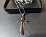 This stainless steel pendant necklace features a 2" long cross hanging on an 11" steel ball chain. The pendant is perfect for those who appreciate religious-themed jewelry and the chain is durable enough for everyday wear. The silver color and sleek design make it a fashionable addition to any outfit. This necklace is ideal for those who prefer a minimalist and timeless look.