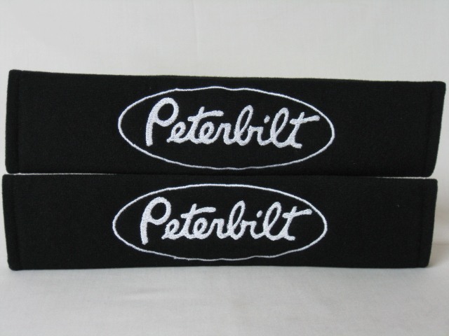 - 2 pieces (1 PAIR) Peterbilt Embroidery Seat Belt Cover Pads (White on Black)