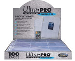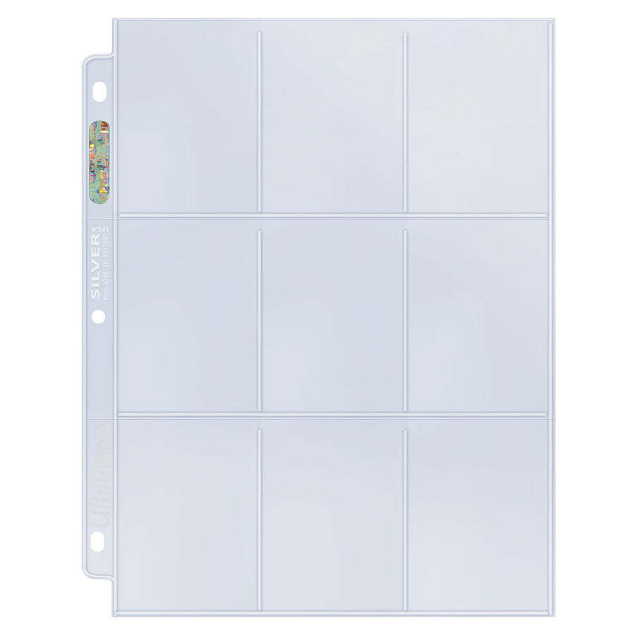 Protect, sort, and store your standard size (2-1/2" X 3-1/2") sports and gaming trading cards with Ultra PRO's Silver Series 9-Pocket 3-Hole Punch Pages for standard-size cards. Made with clear non-PVC, acid-free, and archival-safe polypropylene film, these toploading 9-pocket pages are an ideal choice for all types of trading card collections, artist sketch cards, sticker cards, and much more. Sealed with solid bar seals, these pages provide superior strength and durability for long-lasting use. The spine is sealed with Ultra PRO's hologram for authenticity and 3-hole punched to fit in most 3-ring albums. Each box contains 100 individual pages and is made in California, USA.