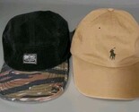 The product is a set of two denim and supply corduroy camo and polo khaki Ralph Lauren adjustable caps hats.