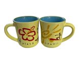 Pair of colorful 2000 Island Heritage mugs featuring tropical Hawaiian icon artwork. Bright yellow exterior with red and gold motifs, turquoise blue interior, and palm tree/sun graphics wrapping around each mug. A cheerful matching set for collectors or everyday use.