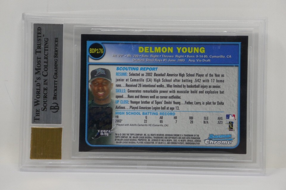Up for sale is a 2003 Bowman Draft Picks Chrome #BDP176 Delmon Young Rookie Card. This has been graded by Beckett.