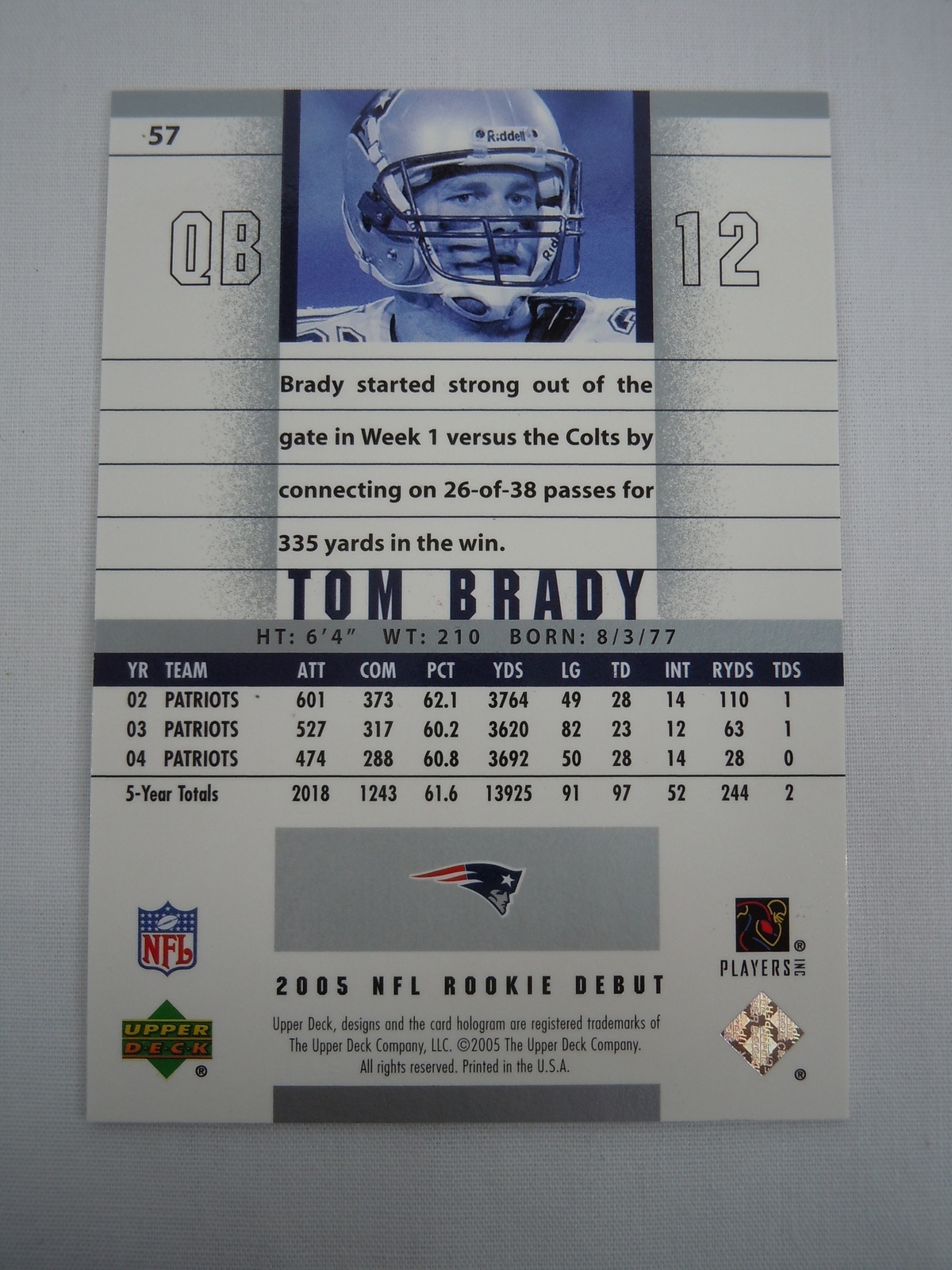 This is a nice example of a 2005 Upper Deck Rookie Debut #57 Tom Brady .Other important information about this card: In 2005 Tom Brady played for the New England Patriots.Please check out our other listings for more great cards.