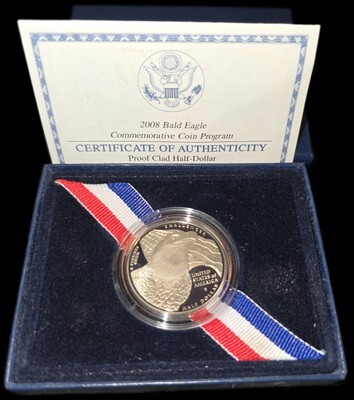 The 2008 Bald Eagle Proof Silver 1/2 Dollar coin from the United States Mint is a commemorative piece of modern silver and clad composition. This uncirculated coin struck in proof quality at the Philadelphia Mint has a fineness of 0.9 and features a striking Bald Eagle design. It comes with a Certificate of Authenticity and Original Government Packaging, making it a prized collector's item for those interested in US coins and commemorative issues.