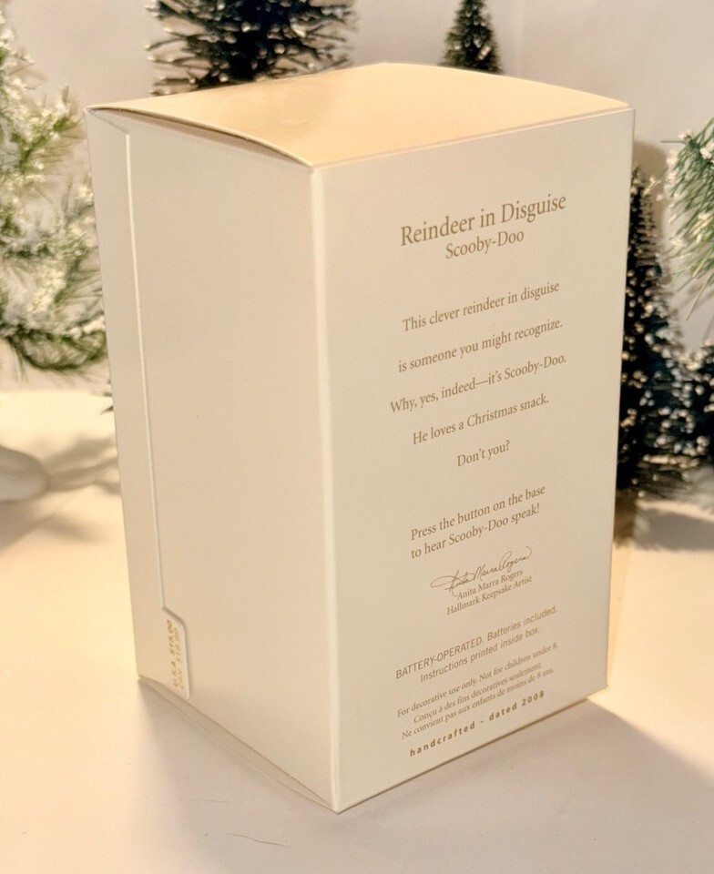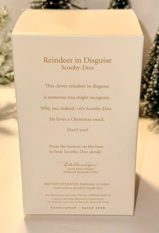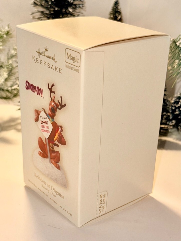 This is the 2008 Magic talking Hallmark Keepsake Ornament featuring Scooby-Doo, title Reindeer In Disguise. This reindeer ornament features the classic cartoon character of television and movie (live and animated) fame. He delivers several lines of amusing dialogue for holiday jollies (batteries not included). He comes fully tested and in excellent condition including original packaging.