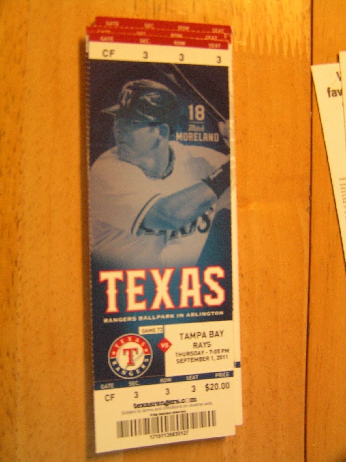 - 2011 Texas Rangers Full Unused Ticket Stub Vs Tampa Bay Rays 9/1