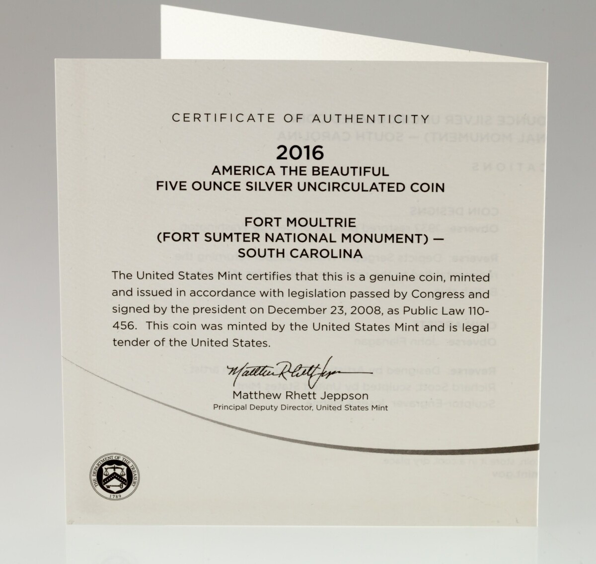 2016 5 Oz. ATB Fort Moultrie Sumter Pièce D'Argent Avec Boîte Et CoA