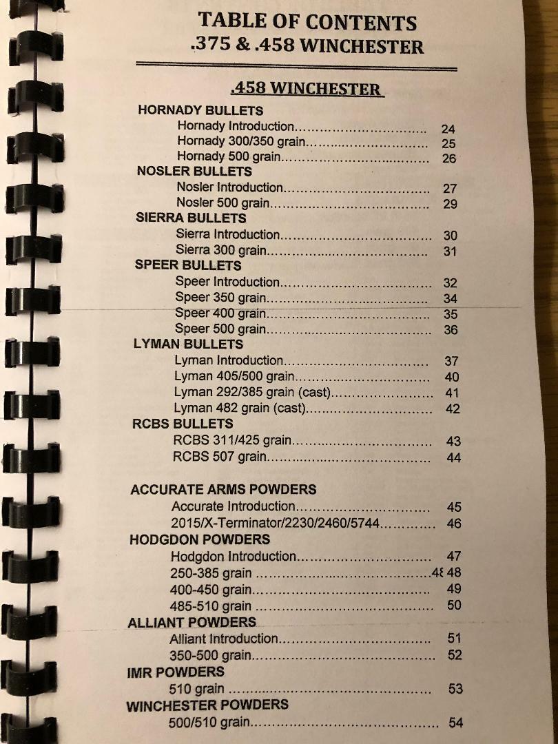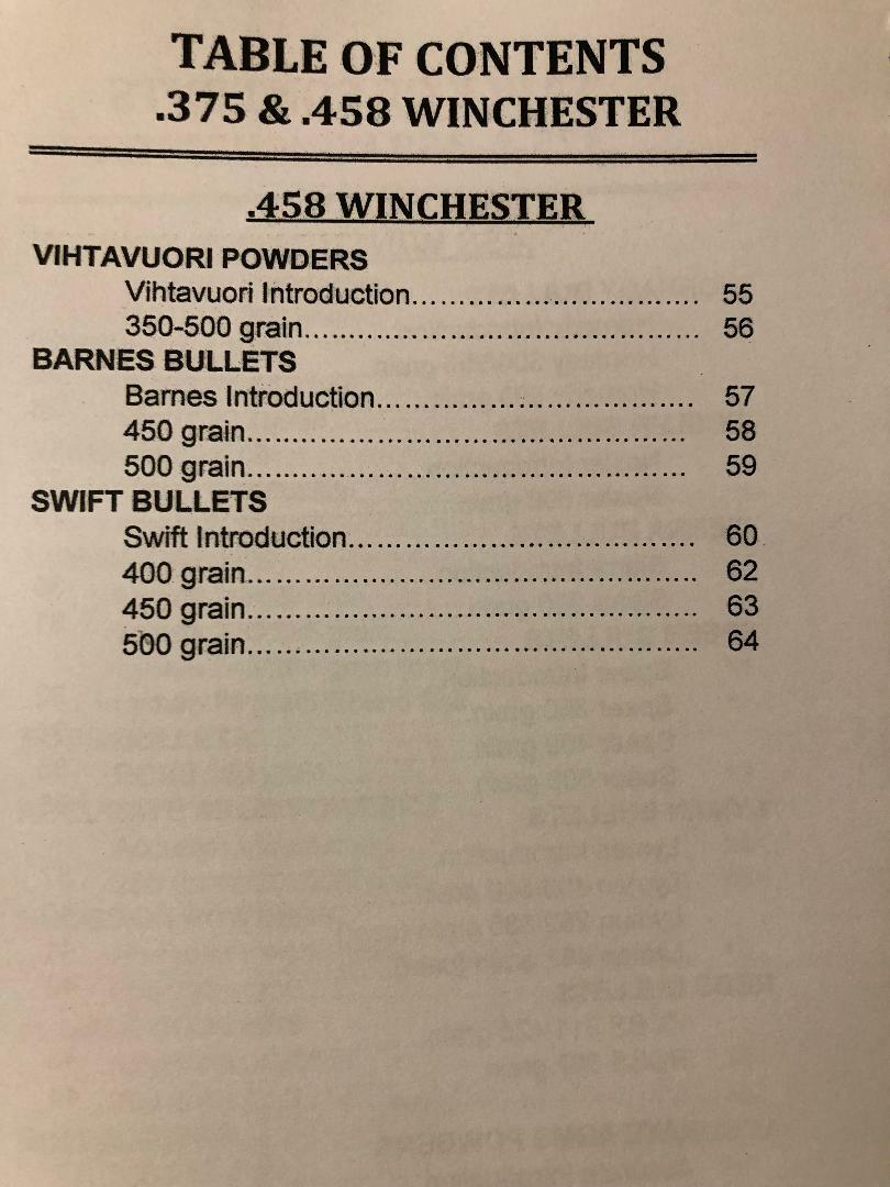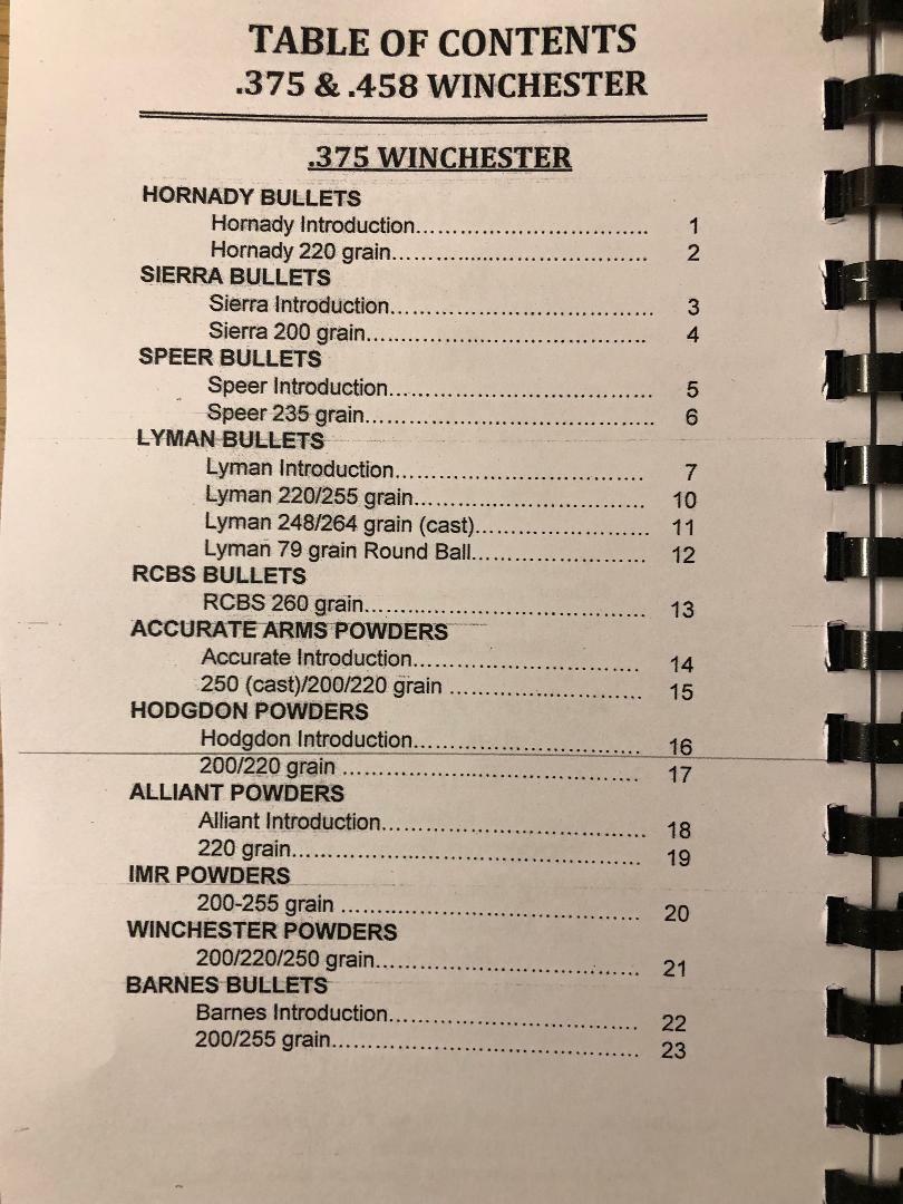 The complete Reloading Manual for the .375 .458 Winchester, new latest edition, 67 pages that features 746 proven loads, 56 bullet designs, 40 different powders.