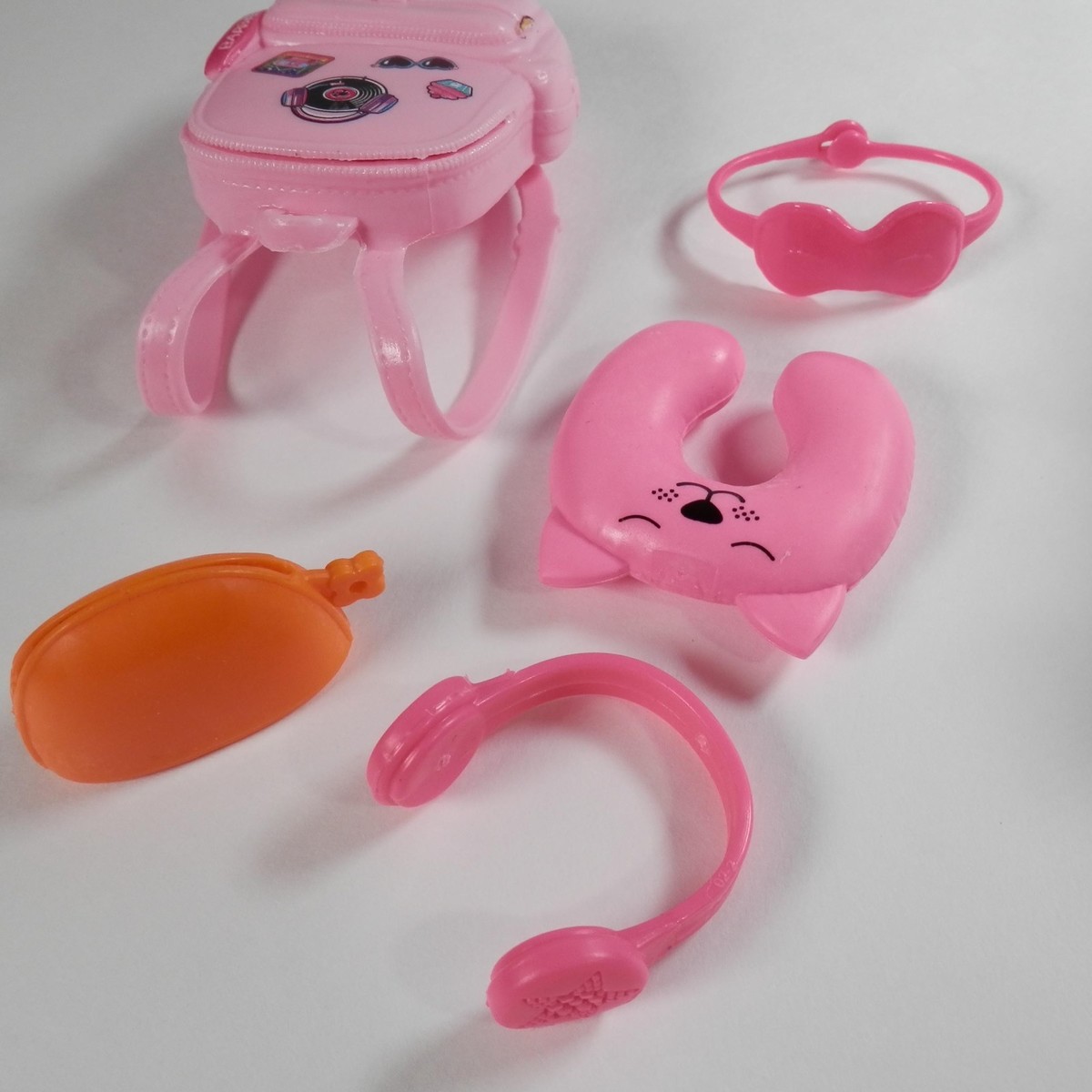 Doll, dress, sneakers, eye mask, suitcase, backpack, headphones, neck pillow, and toiletry bag