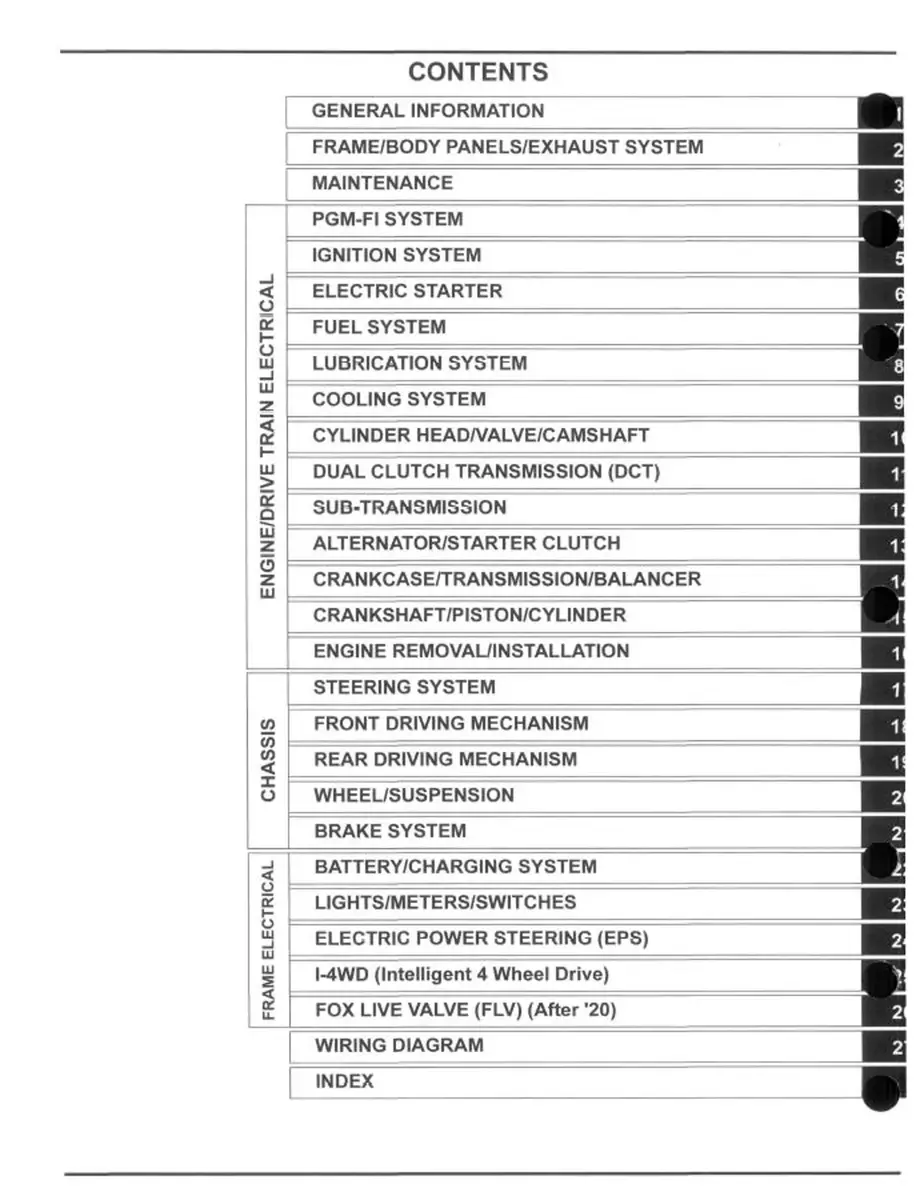 This manual includes model years 2019-2024 for the Honda Talon 1000. This service manual is the most up to date version and includes many different trim packages and models of the Honda Talon 1000 (see images for models). This manual would be used by a technician at a shop.